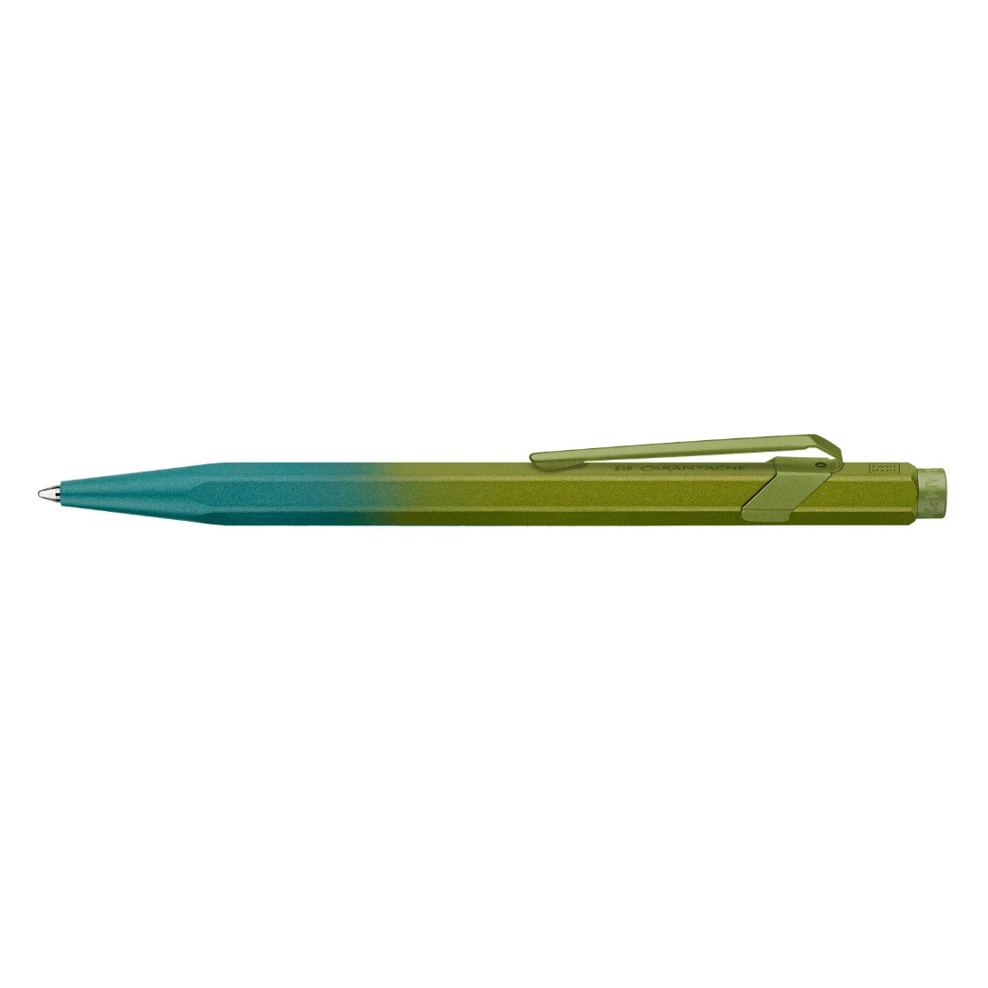 Cuerpo hexagonal de aluminio, ligero y resistente Diseño inspirado en los colores de las curiosidades de la Naturaleza Barniz metálico que cambia de azul a verde Clip y botón barnizados en verde metálico