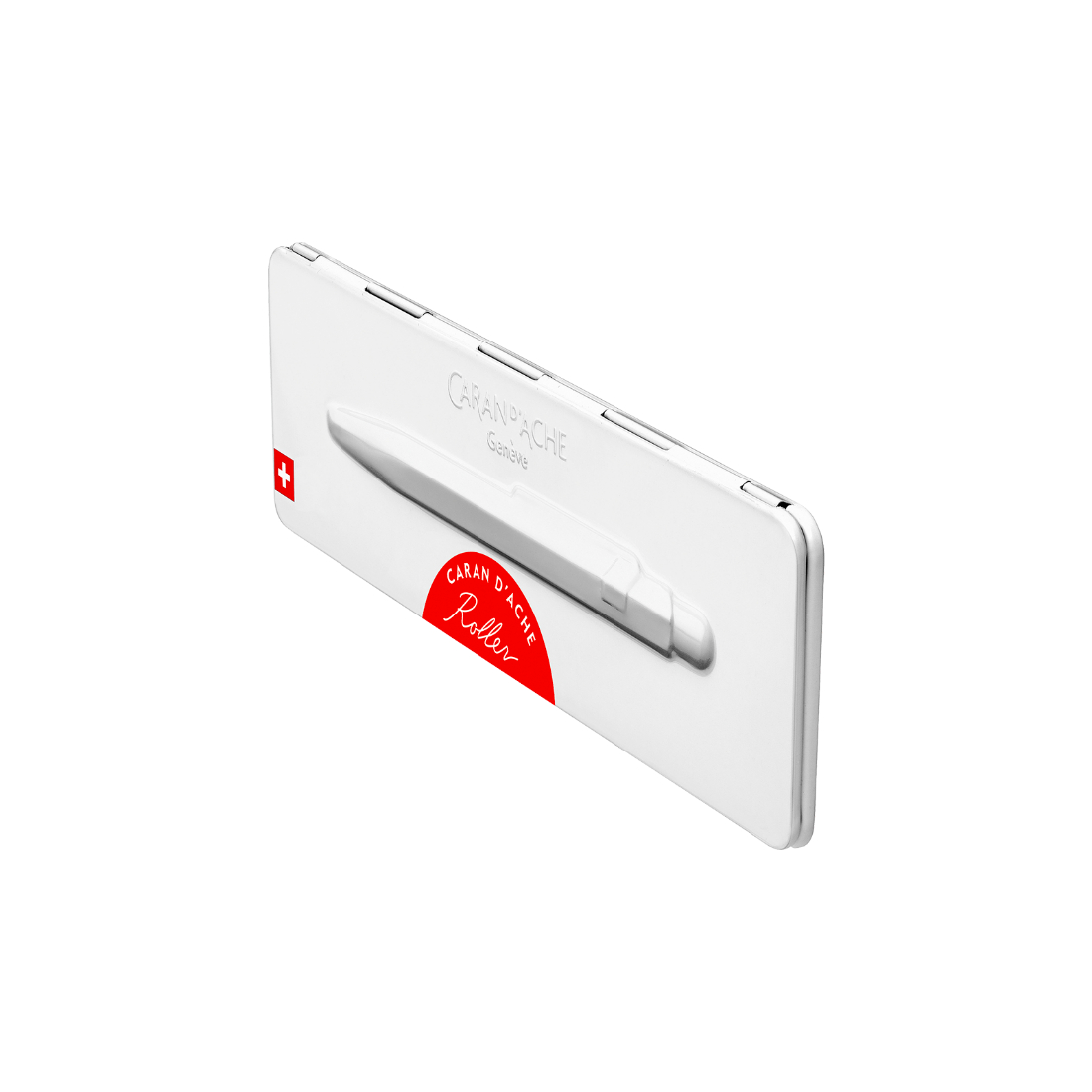 Embalaje Slimpack de metal blanco con pegatina a juego con el modelo 849 Roller e indica la forma de escritura del roller. Dimensiones: 19,9 x 5,9 x 1,7 cm