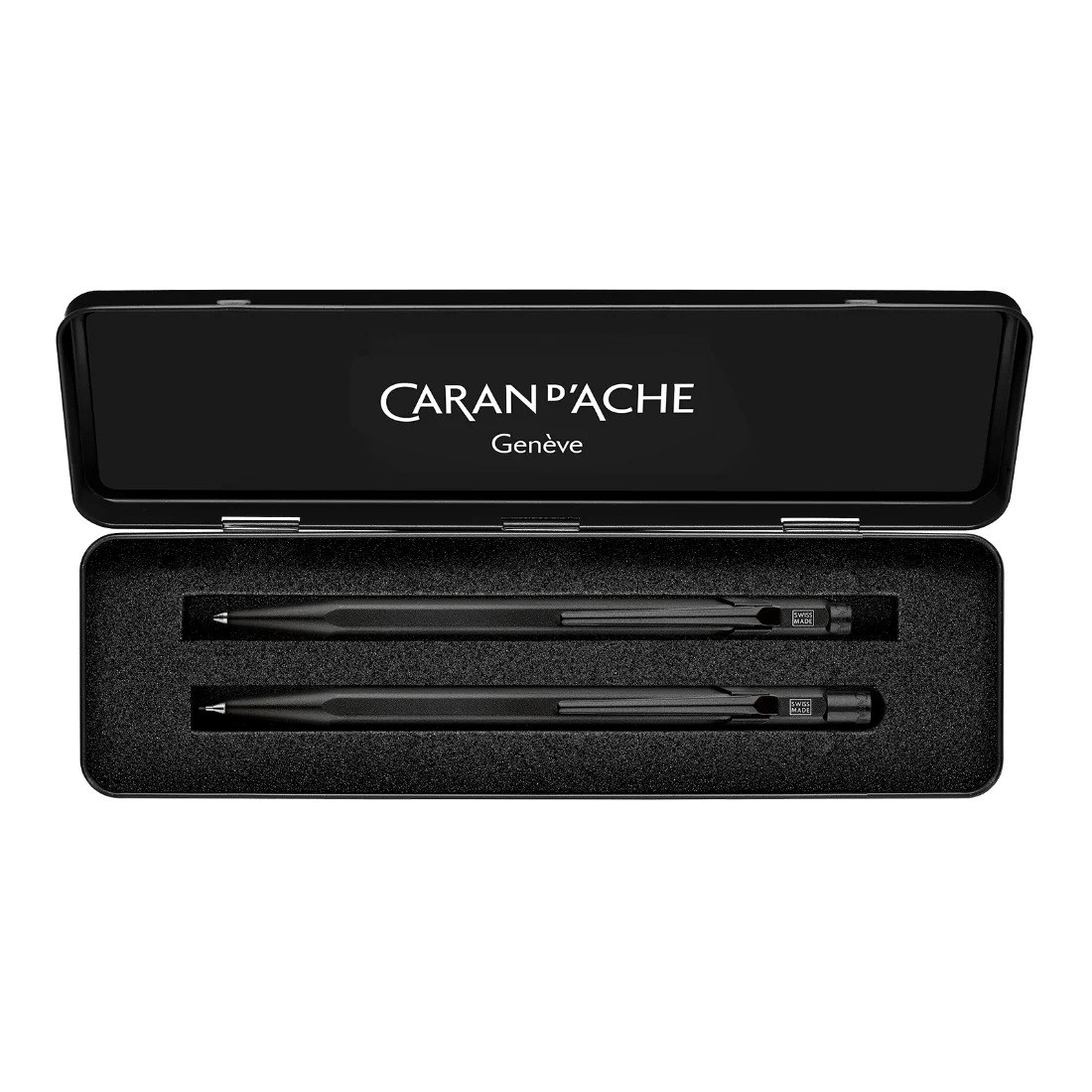Estuche de metal negro brillante con logotipo de Caran d Ache en el interior y el exterior Espuma de alta densidad con recortes Dimensiones: 18,2 cm x 5,4 cm x 1,7 cm Peso: 100 g (70 g sin incluir productos)