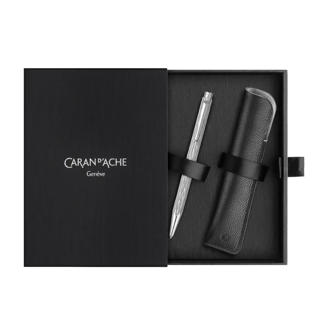 Cuerpo hexagonal de latón acabado paladio Técnica de grabado con efecto martillado esculpido en el material Logotipo de Caran d Ache grabado con láser en el pulsador Paladio pulsador y clip flexible
