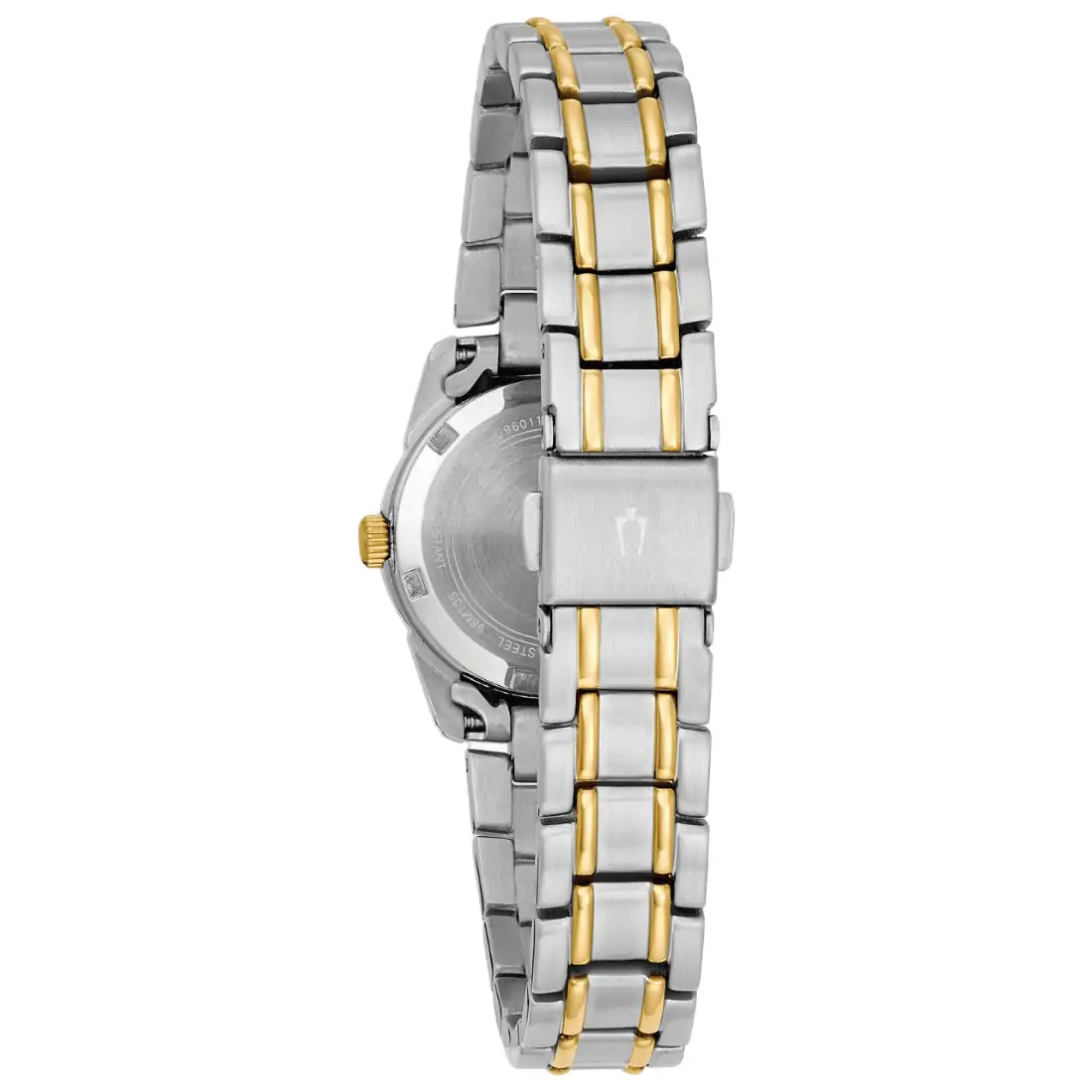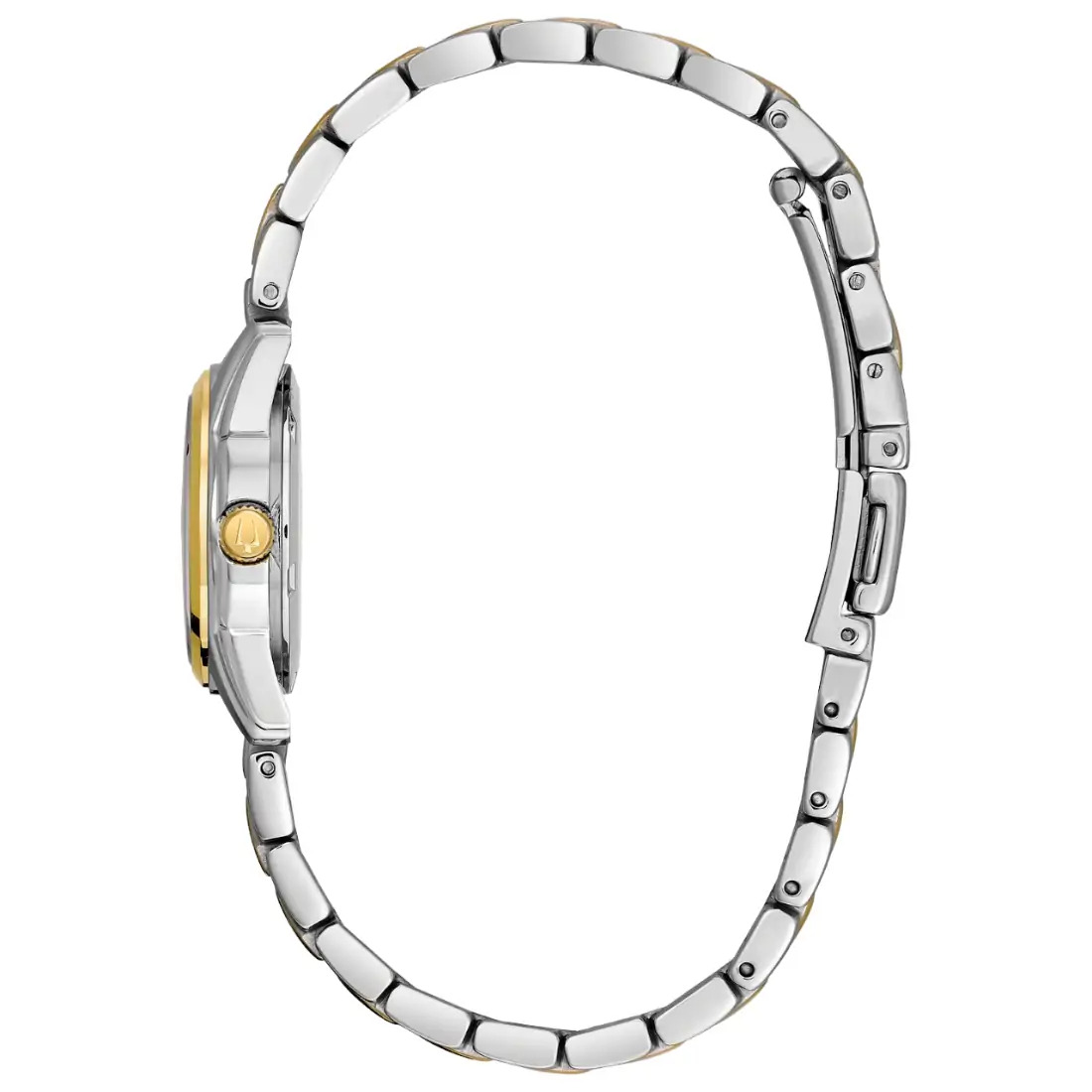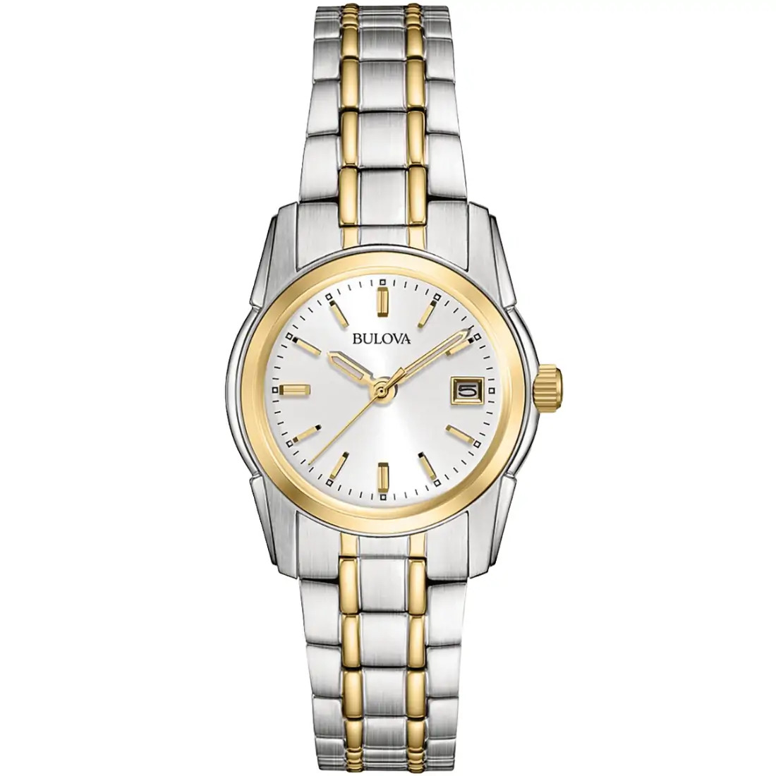 Reloj Bulova Classic 98M105 para Dama. Movimiento de cuarzo de 3 manecillas y fechador. Caja y brazalete realizados en acero inoxidable en dos tonos acero/dorado,broche desplegable de doble pulsador. Carátula blanca-plateada, indicadores y manecillas en dorado. Cristal mineral.