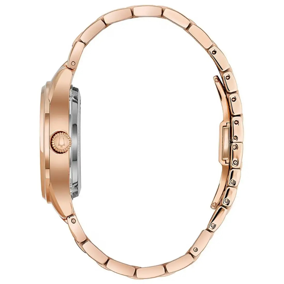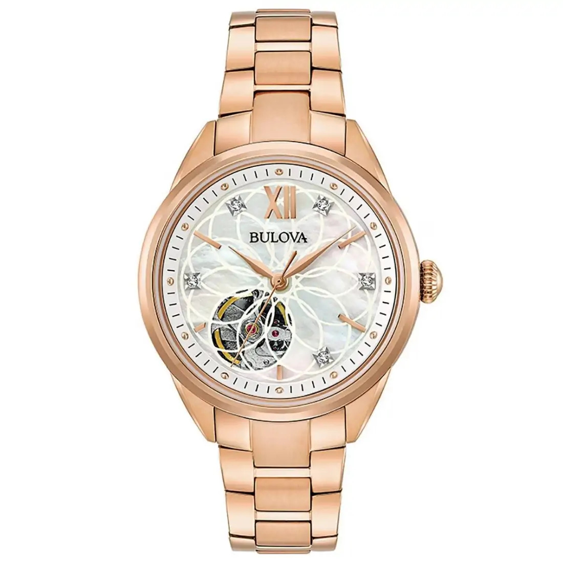 Reloj Bulova con Diamantes para dama. 5 diamantes montados a mano de forma individual en carátula como indicadores. Movimiento mecánico de cuerda automática de 3 manecillas. Reserva de marcha de 40 horas. Caja y brazalete realizados en acero inoxidable, broche desplegable de doble pulsador. Carátula de madre perla con diseño y apertura que permite ver el funcionamiento del reloj, decorada con diamantes, indicadores y manecillas en palteado. Tapa transparente Cristal de zafiro.