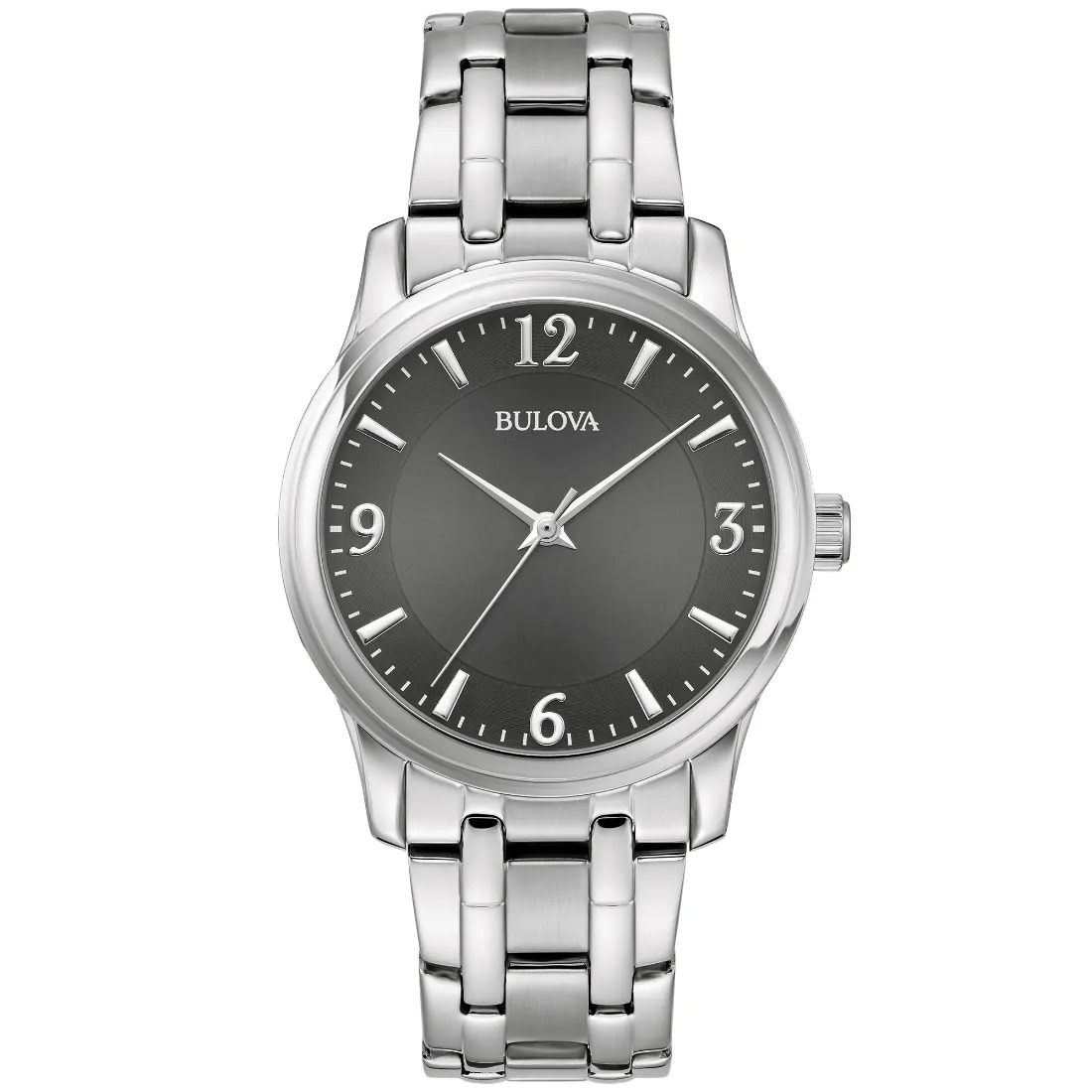 Reloj Bulova Corporate para caballero. Movimiento de cuarzo de 3 manecillas. Caja y brazalete realizados en acero inoxidable, con broche desplegable. Carátula gris con indicadores en plateado. Cristal mineral.