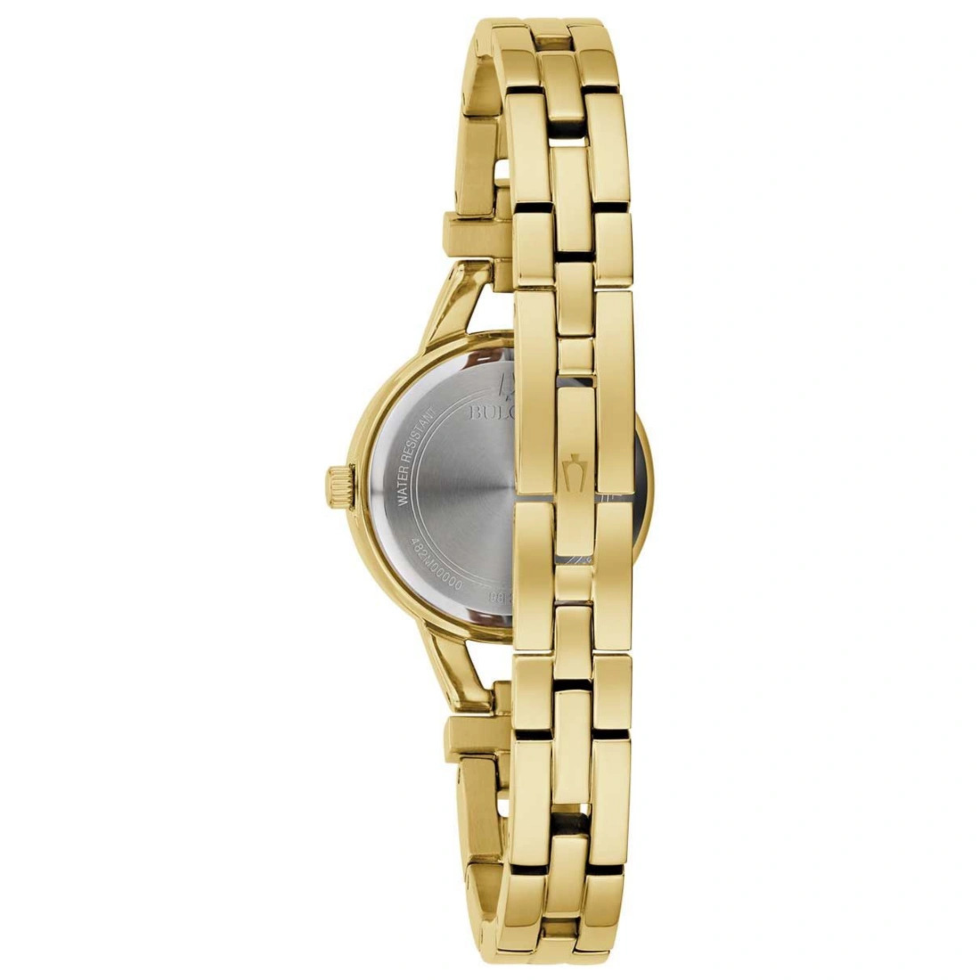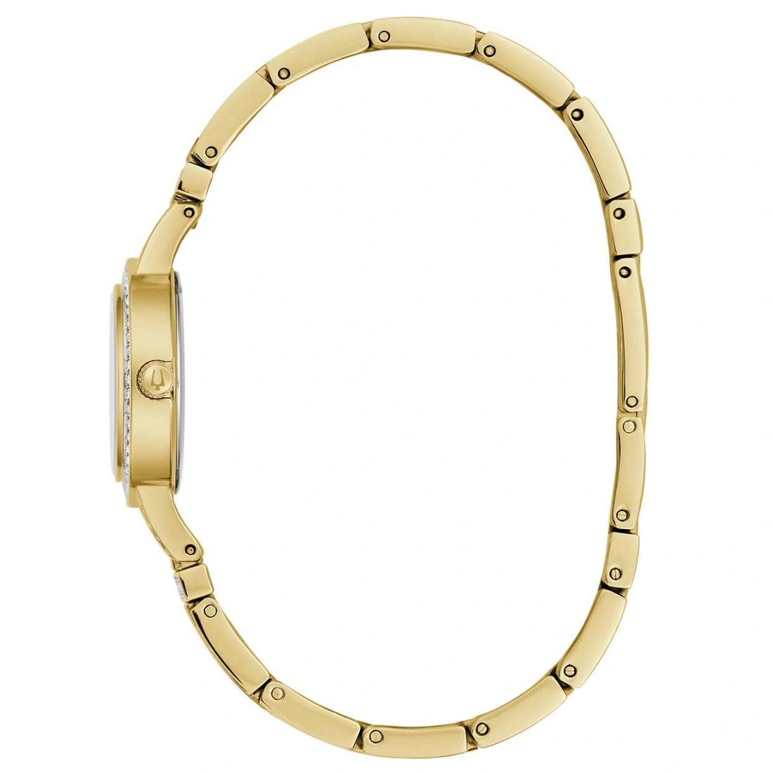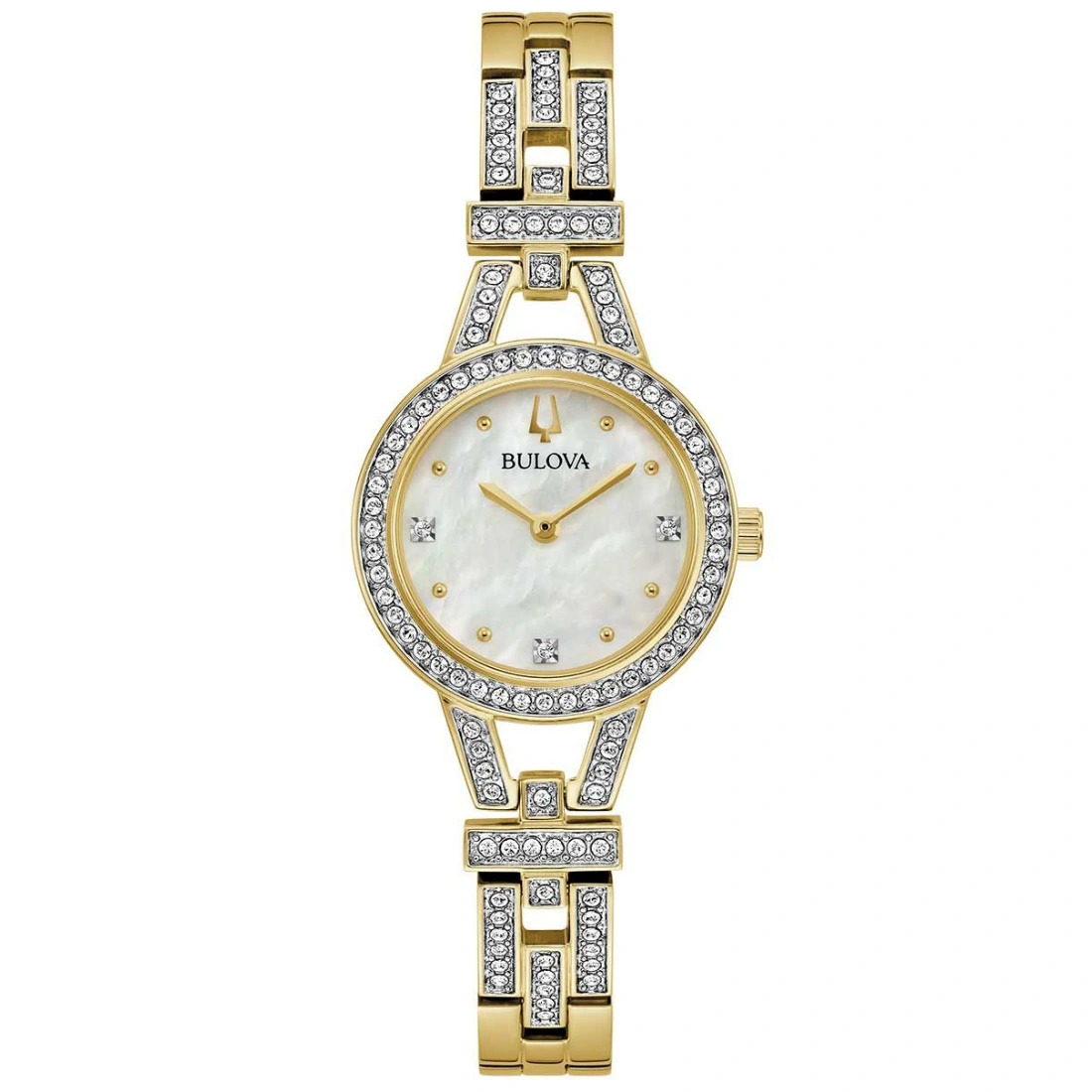 Reloj Bulova colección Crystal para Dama. Cristales montados de forma individual en carátula y brazalete. Movimiento de Cuarzo de 2 manecillas. Caja y brazalete realizados en acero inoxidable acabado PVD dorado