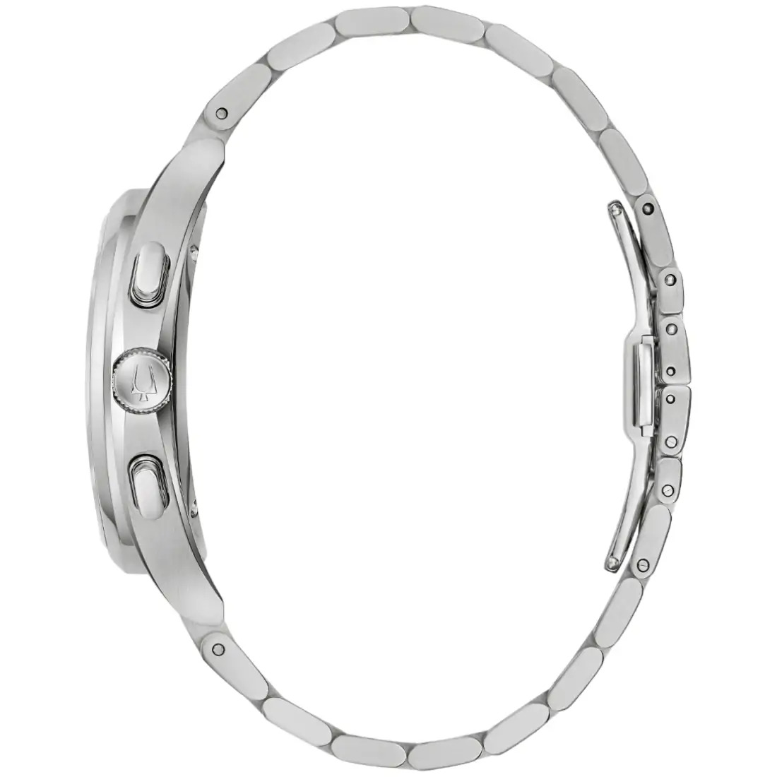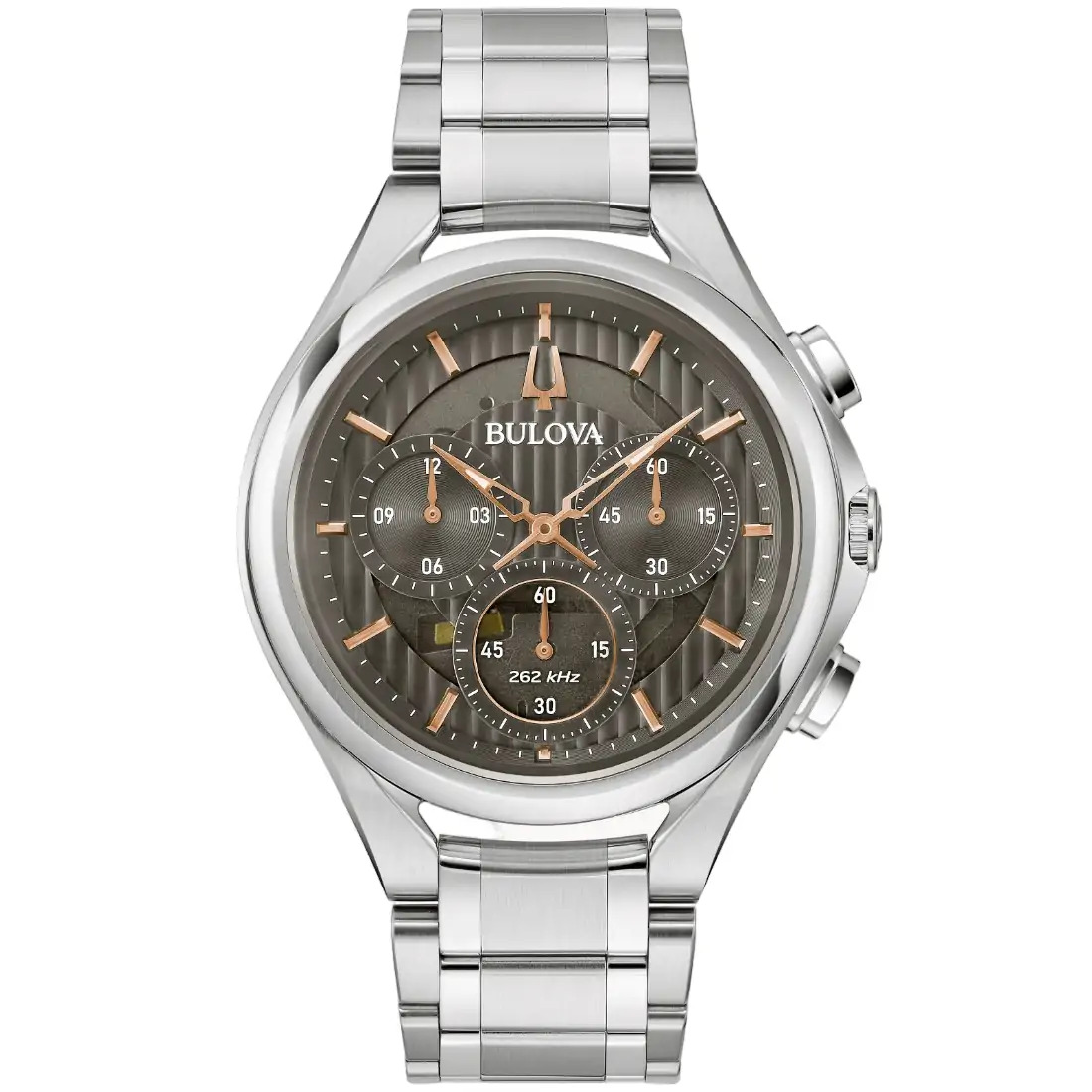 Reloj Bulova Curv para Caballero. El primer movimiento cronógrafo curvo de 5 manecillas, con tecnología de cuarzo de alto rendimiento (HPQ), exclusiva de Bulova, con una frecuencia de vibración de 262 kHz que brinda gran exactitud. Tapa transparente atornillable. Cristal de zafiro curvo con tratamiento antirreflejante. Resistencia al agua de hasta 30 metros.