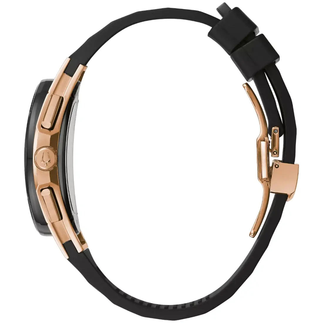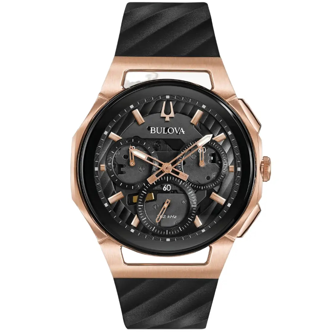 Reloj Bulova CURV para caballero. El primer movimiento cronógrafo curvo del mundo con tecnología de cuarzo de alto rendimiento, exclusiva de Bulova, con una frecuencia de vibración de 262 kHz que brinda gran exactitud. Cronógrafo que mide hasta 11 horas 59 minutos de 5 manecillasCaja realizada en acero inoxidable acabado PVD oro rosa y bisel negro. Carátula esqueletada negra con indicadores y manecillas en oro rosa. Tapa transparente atornillable.