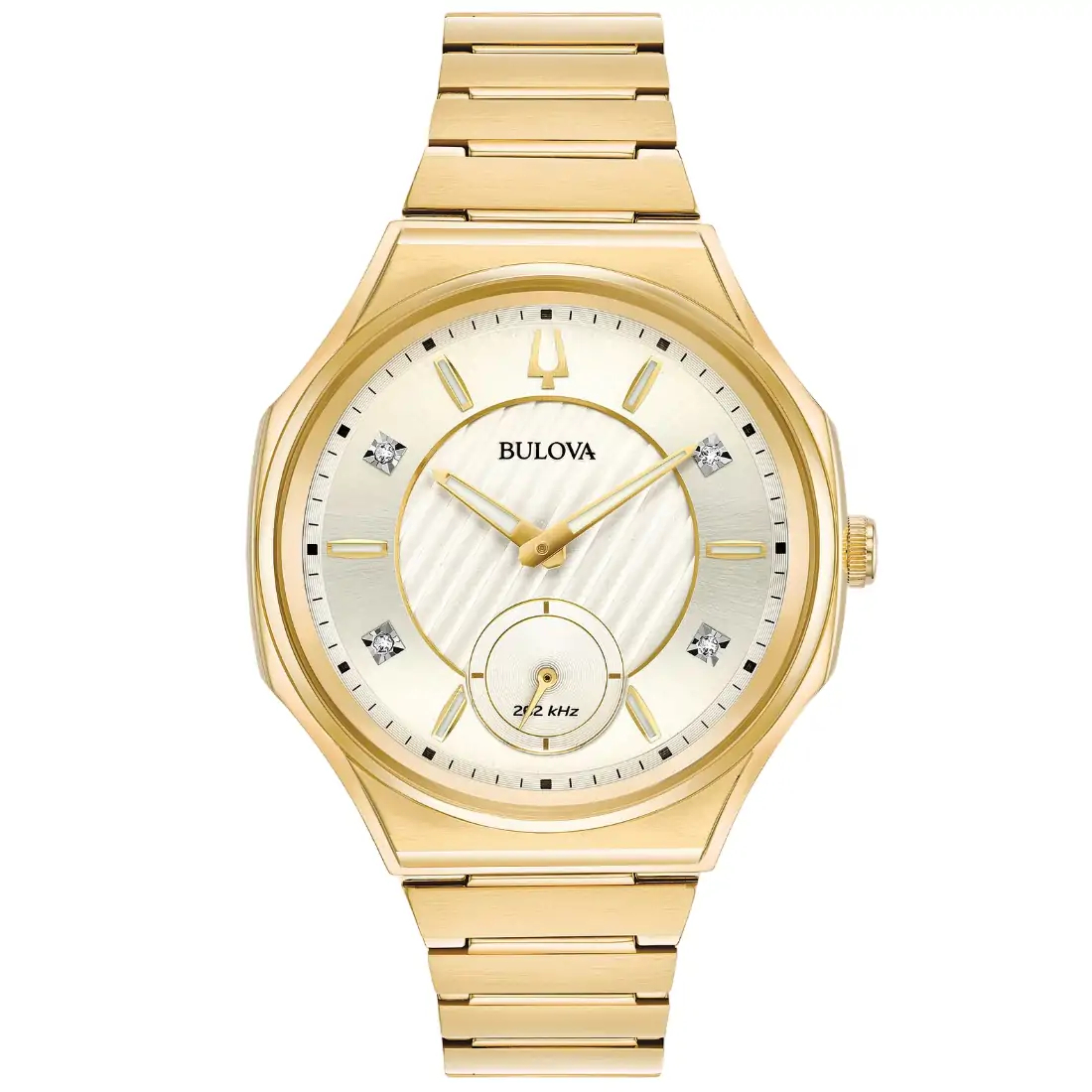 Reloj Bulova CURV para Dama. El primer movimiento cronógrafo curvo del mundo con tecnología de cuarzo de alto rendimiento, exclusiva de Bulova, con una frecuencia de vibración de 262 kHz que brinda gran exactitud. Movimiento de cuarzo de alto rendimiento de 3 manecillas. 4 diamantes montados de forma individual a mano en carátula. Caja y brazalete realizados en acero inoxidable en acabado PVD dorado, broche desplegable de doble pulsador. Carátula texturizada dorada, indicadores y manecillas luminiscentes en dorado. Cristal de zafiro curvo con tratamiento anti-reflejante. Tapa transparente atornillable. Resistencia al agua de hasta 30 metros.