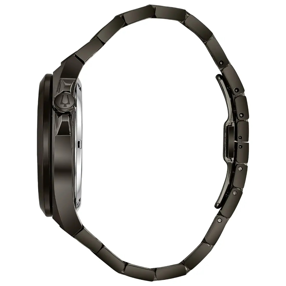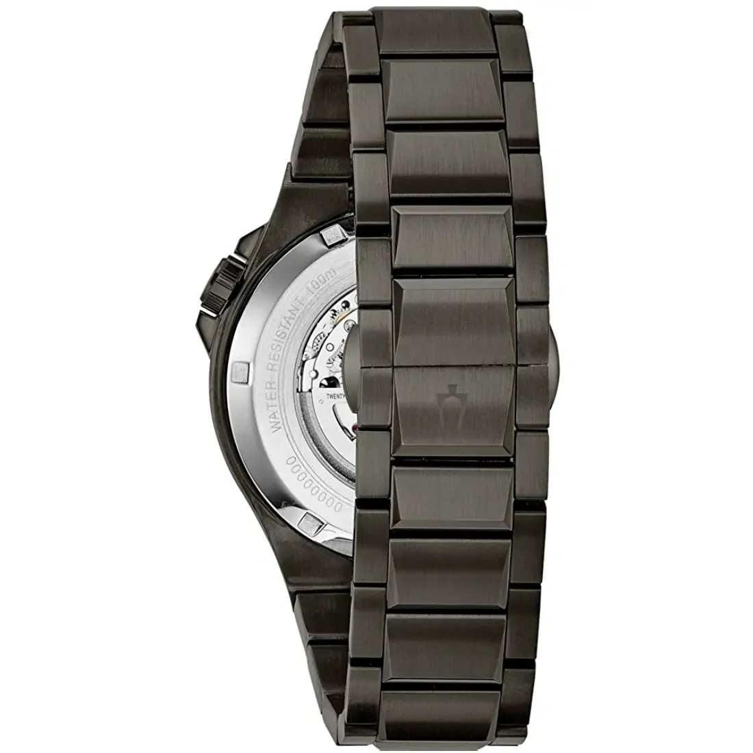 Reloj Bulova Máquina para caballero. Movimiento mecánico de cuerda automática de 3 manecillas. Reserva de marcha de 40 horas Caja y brazalete de acero inoxidable, acabado PVD gris metálico, broche desplegable de doble pulsador. Carátula esqueletada negra indicadores y manecillas en plateado. Tapa transparente. Cristal de zafiro.