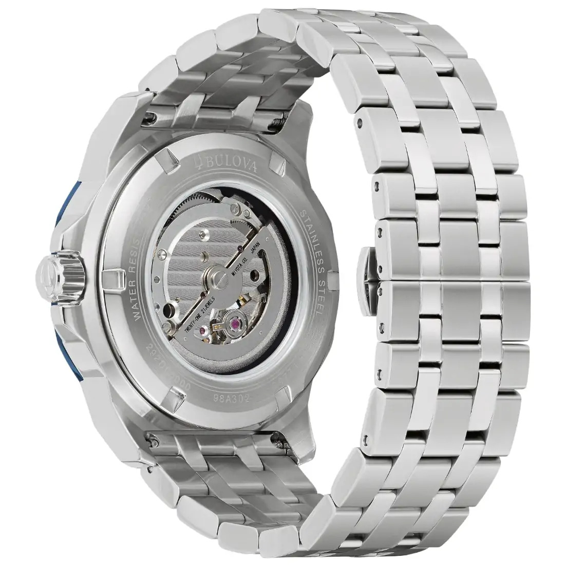 Reloj Bulova colección Marine Star para Caballero. Movimiento mecánico de cuerda automática de 3 manecillas. Caja y brazalete realizados en acero inoxidable, broche desplegable de doble pulsador. Bisel superior azul. Carátula texturizada en azul, indicadores y manecillas luminiscentes en plateado, detalles deportivos en naranja. Corona atornillable. Cristal mineral
