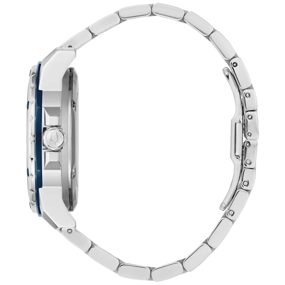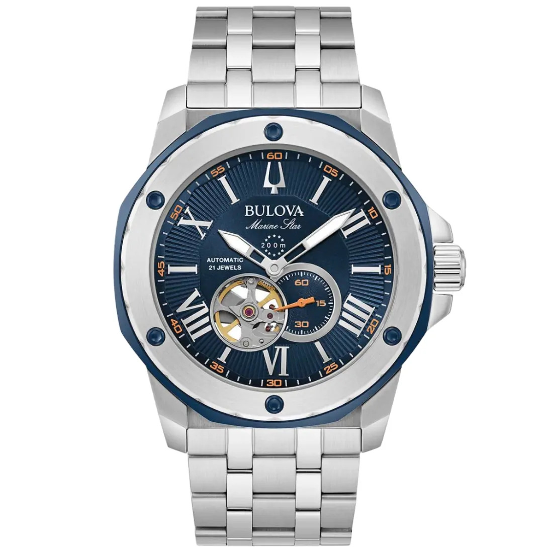 Reloj Bulova colección Marine Star para Caballero. Movimiento mecánico de cuerda automática de 3 manecillas. Caja y brazalete realizados en acero inoxidable, broche desplegable de doble pulsador. Carátula texturizada en azul, indicadores y manecillas luminiscentes en plateado, detalles deportivos en naranja. Corona atornillable. Cristal mineral.