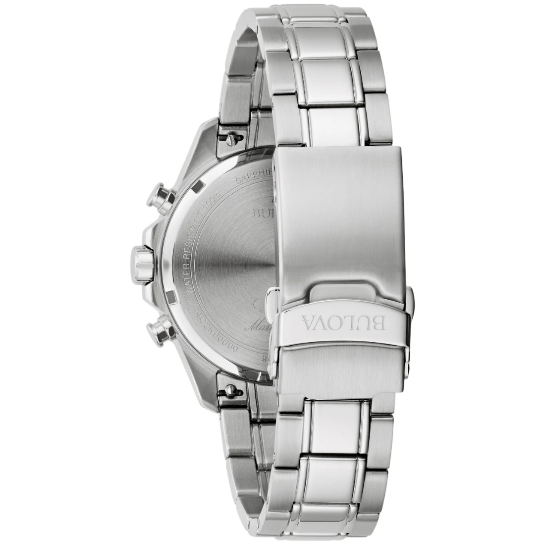 Reloj Bulova colección Marine Star series B para caballero. Movimiento cronógrafo de cuarzo de 6 manecillas y 3 subcarátulas. Caja 41 mm y brazaletes hechos de acero inoxidable, broche desplegable de pulsador. Carátula azul océano con manecillas y marcadores aplicados en color plata con Super-Luminova y fechador.