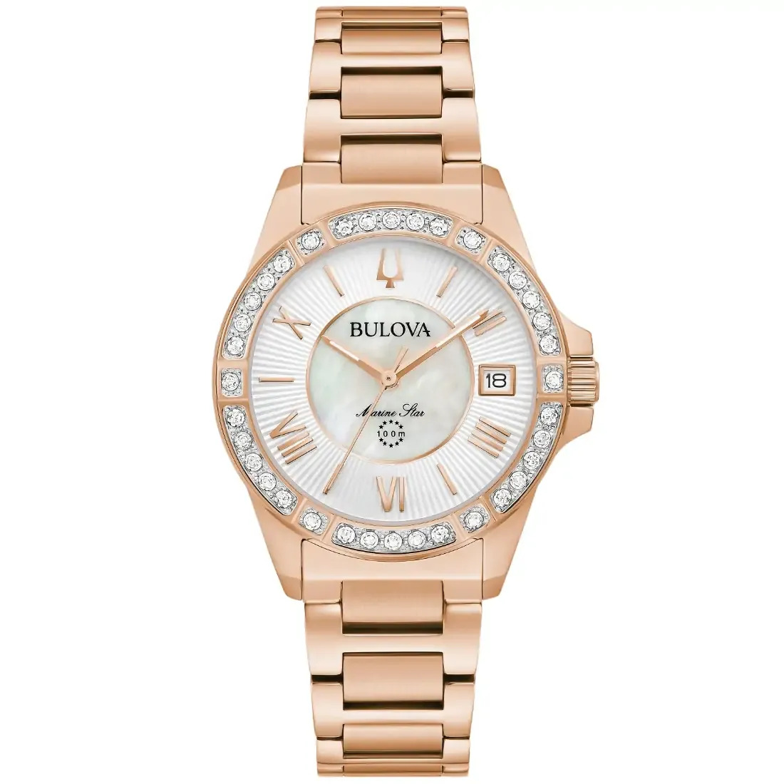 Reloj Bulova Colección Marine Star para dama.36 Diamantes incrustados a mano de forma individual en bisel superior. Movimiento de cuarzo de 3 manecillas y fechador. Caja y brazalete realizados en acero inoxidable acabado PVD oro rosa, broche desplegable de doble pulsador. Carátula en madre perla blanca, Indicadores en estilizados números romanos y manecillas en oro rosa.