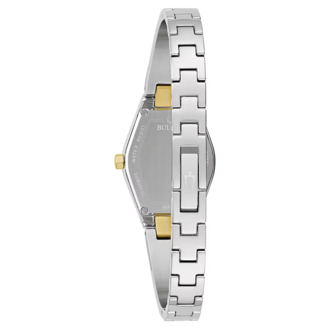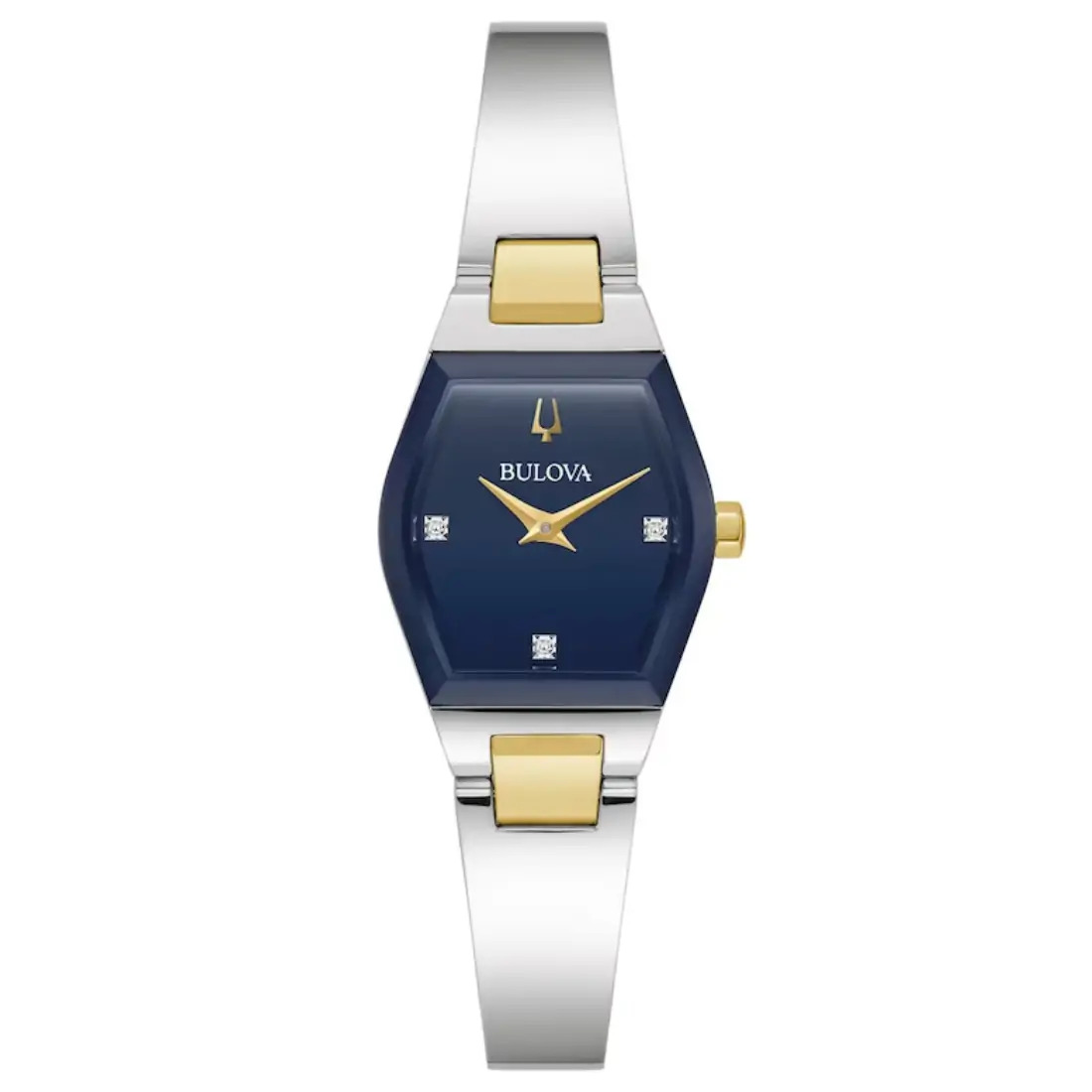 Reloj Bulova Gemini para Dama.3 diamantes montados de forma individual a mano en carátula como indicadores. Movimiento de cuarzo de 2 manecillas. Caja estilo tonneau y brazalete realizados en acero inoxidable, eslabones y corona en PVD dorado, broche tipo joyería. Carátula azul, manecillas en dorado. Cristal mineral metalizado de borde a borde.