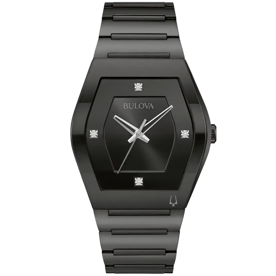 Reloj Bulova Gemini para caballero.4 diamantes montados de forma individual a mano en carátula como indicadores. Movimiento de cuarzo de 3 manecillas. Caja con moderno estilo tontea y brazalete realizados en acero inoxidable acabado PVD negro, broche desplegable de doble pulsador. Carátula negra, manecillas en plateado. Cristal mineral metalizado de borde a borde.