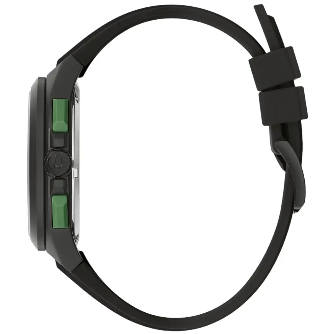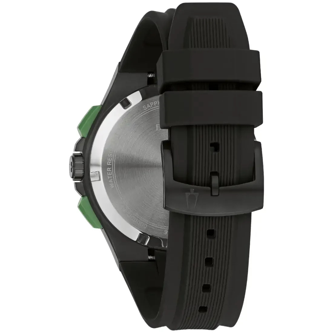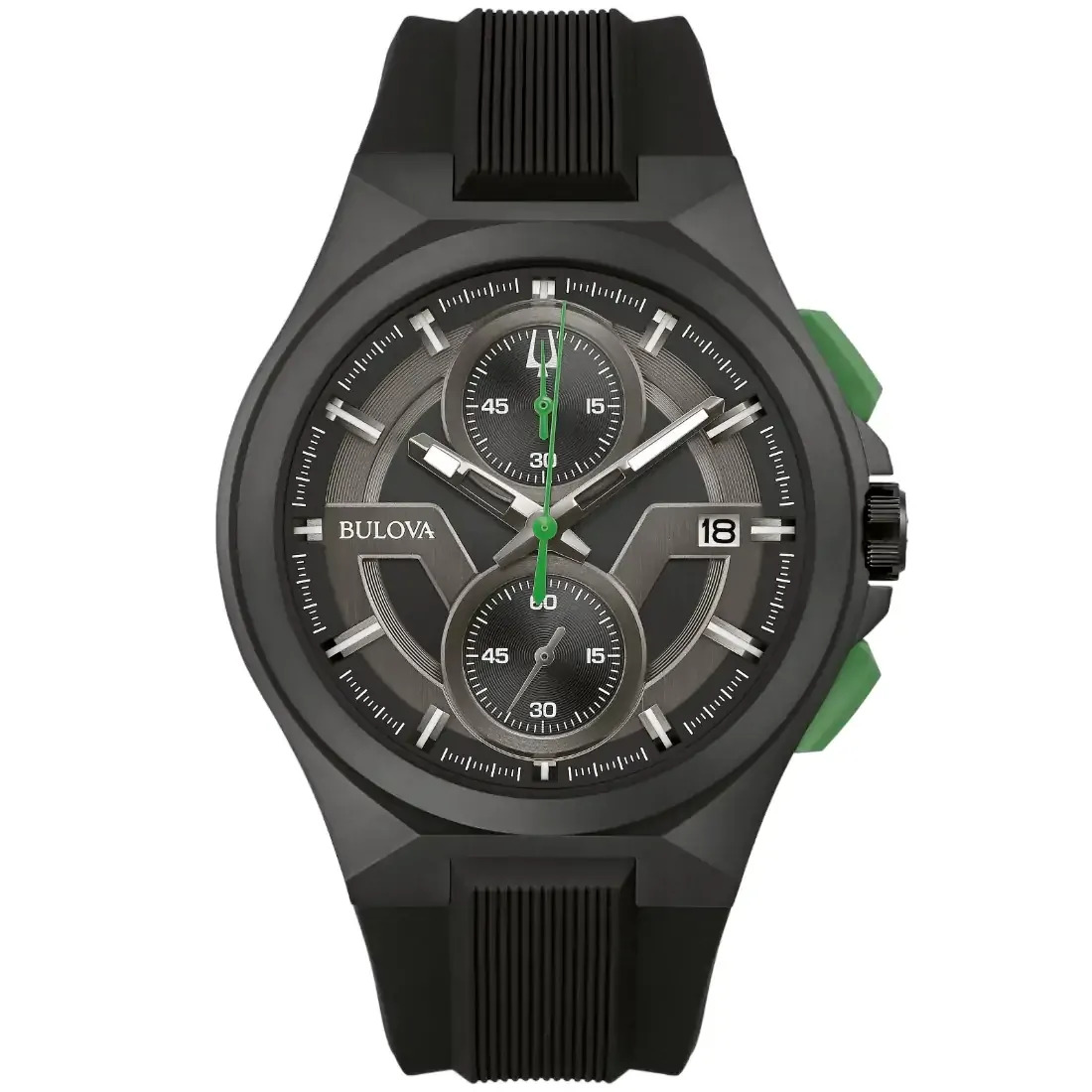 Reloj Bulova Colección Máquina para caballero. Movimiento cronógrafo de cuarzo de 5 manecillas, 2 subcarátulas y fechador. Caja realizada en acero inoxidable acabado PVD negro. Carátula gris, Indicadores, manecillas luminiscentes en gris, detalles deportivos en verde. Correa de caucho negro con broche tipo hebilla de 3 piezas Cristal mineral.