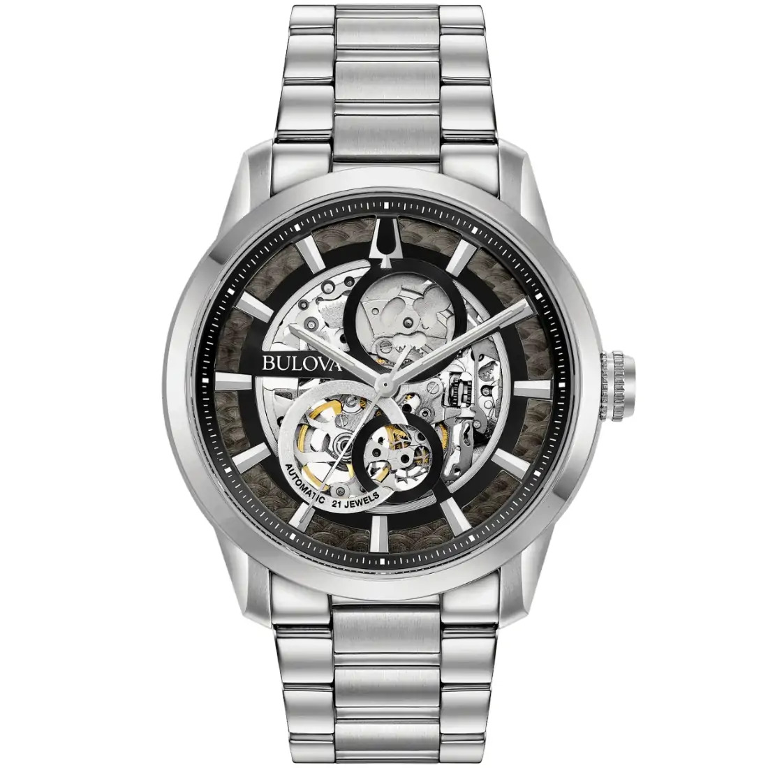 Reloj Bulova Colección Sutton para caballero. Movimiento mecánico de cuerda automática de 3 manecillas. Caja y brazalete realizados en acero inoxidable, broche desplegable de doble pulsador. Carátula negra esqueletada que permite ver el mecanismo en funcionamiento, indicadores y manecillas en plateado. Cristal mineral abombado, Tapa transparente.
