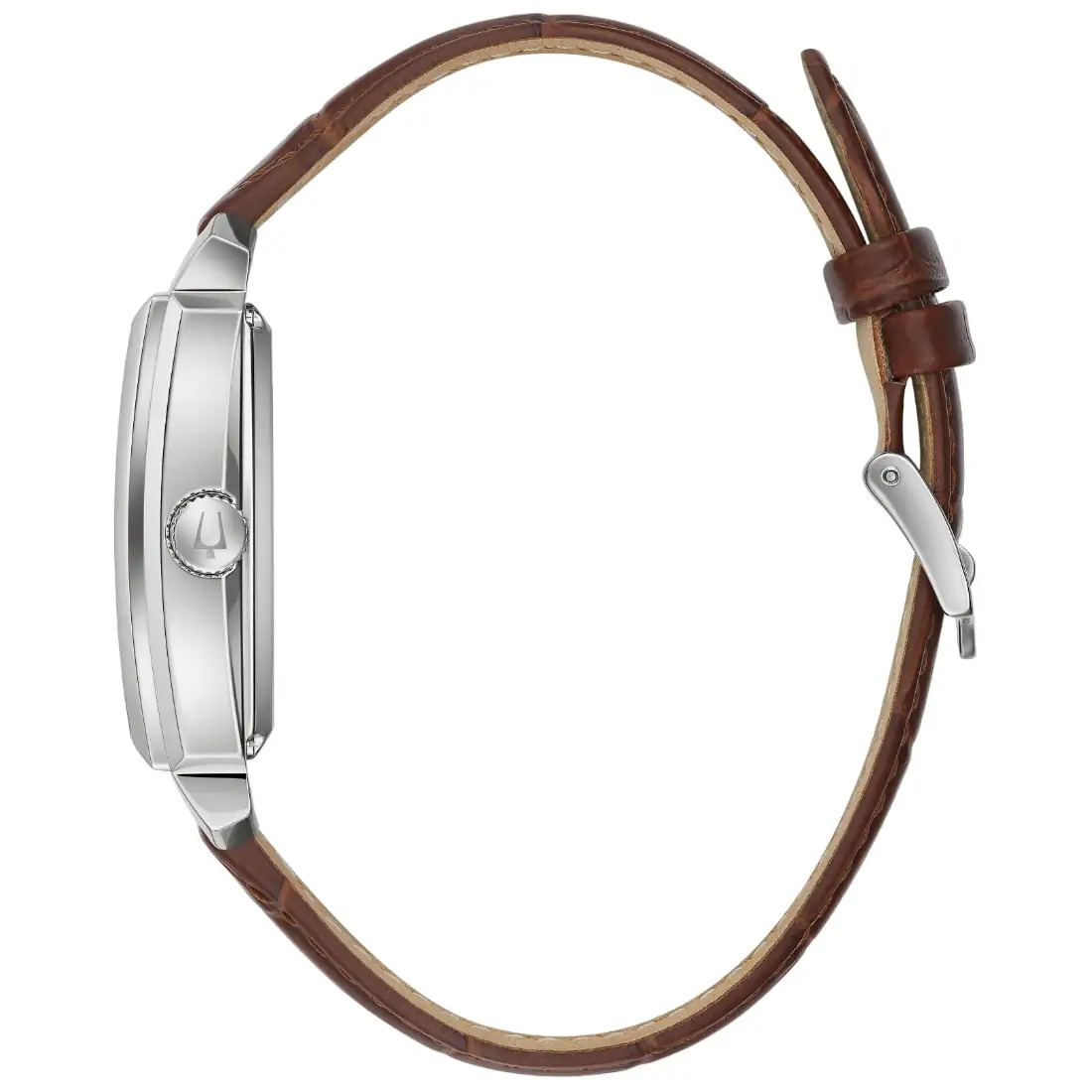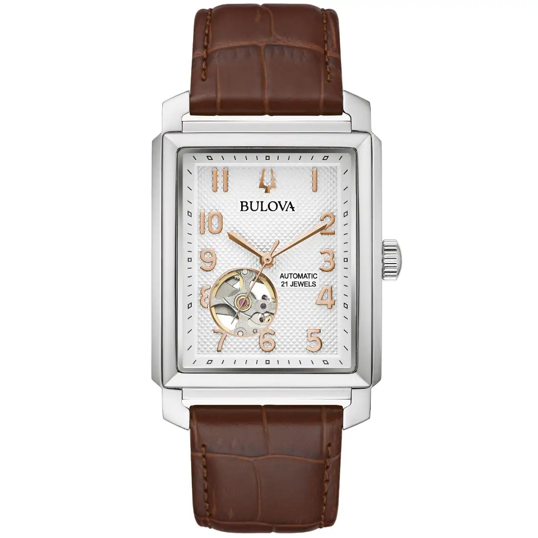 Reloj Bulova para caballero Colección Sutton, inspirado en el Bulova 1948 President. Reserva de marcha de 42 horas. Movimiento mecánico de cuerda automática de 3 manecillas. Caja rectangular realizada en acero inoxidable. Carátula texturizada blanca, con apertura que permite ver el funcionamiento del reloj en movimiento, manecillas e indicadores en oro rosa. Correa de piel café acabado tipo cocodrilo, broche tipo hebilla de 3 piezas. Tapa transparente. Cristal mineral. n