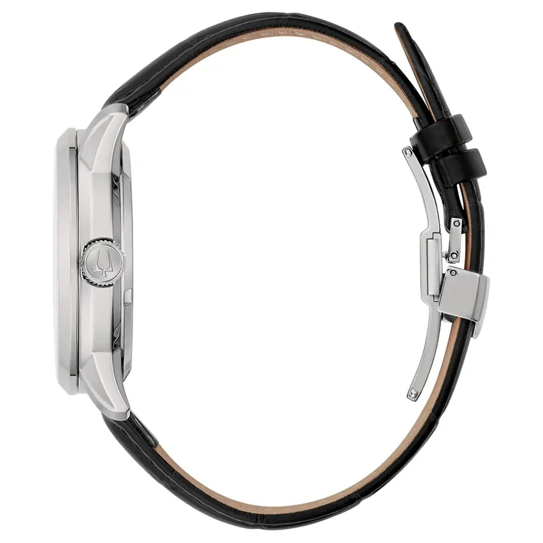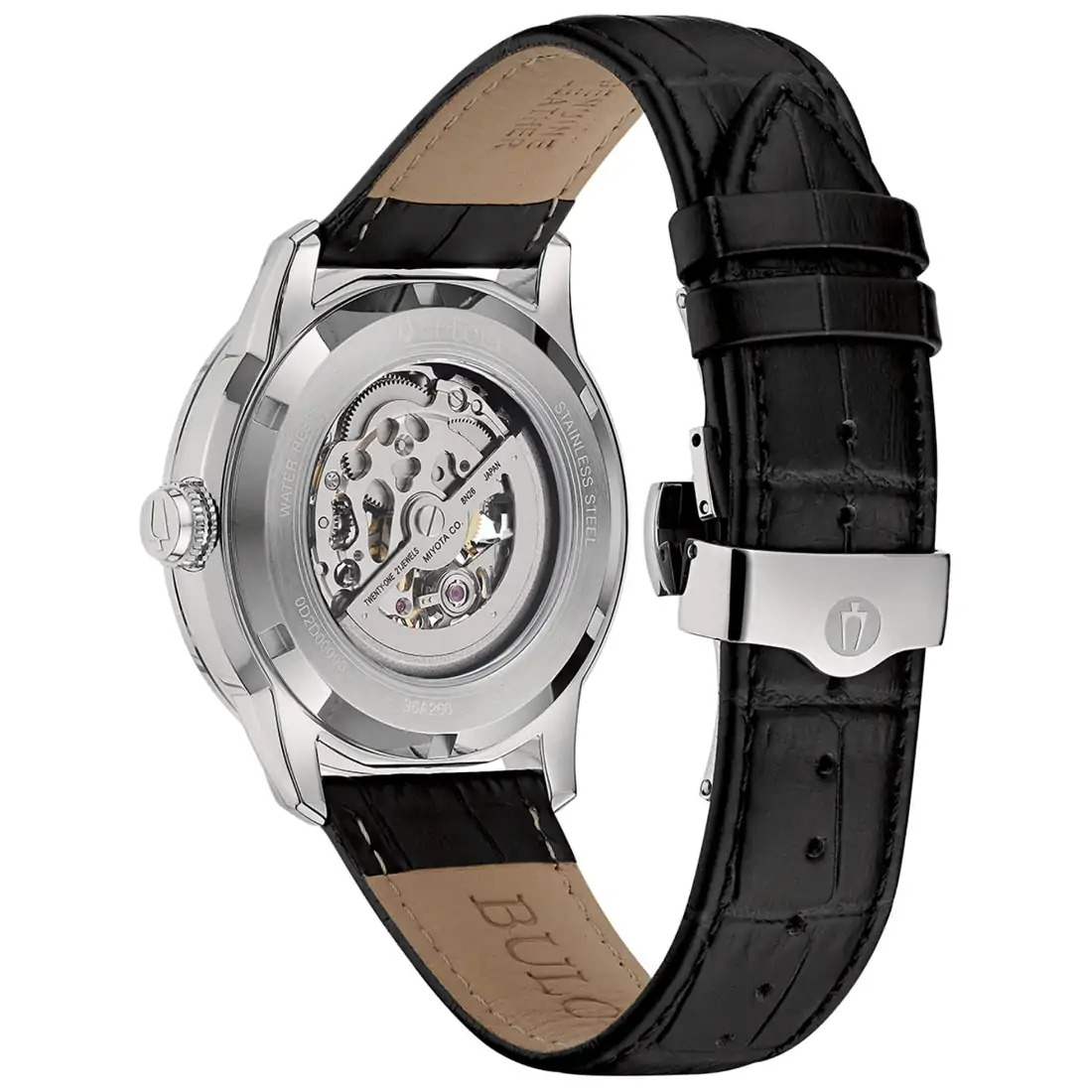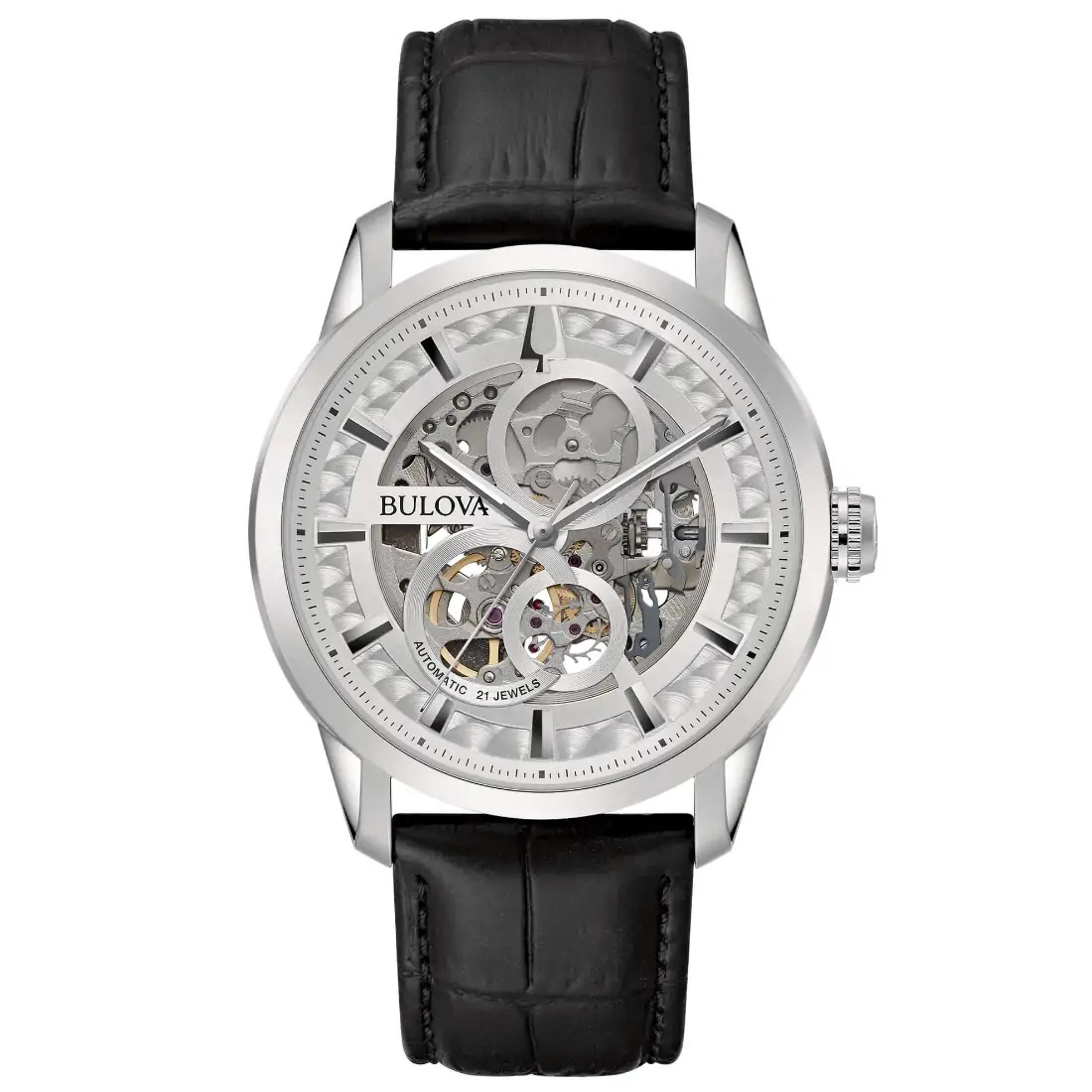 Reloj Bulova Colección Sutton para caballero. Movimiento mecánico de cuerda automática de 3 manecillas. Caja en acero inoxidable, y correa de piel con broche desplegable de doble pulsador. Carátula plateada esqueletada que permite ver el mecanismo en funcionamiento, indicadores y manecillas en plateado. Cristal mineral abombado, Tapa transparente.
