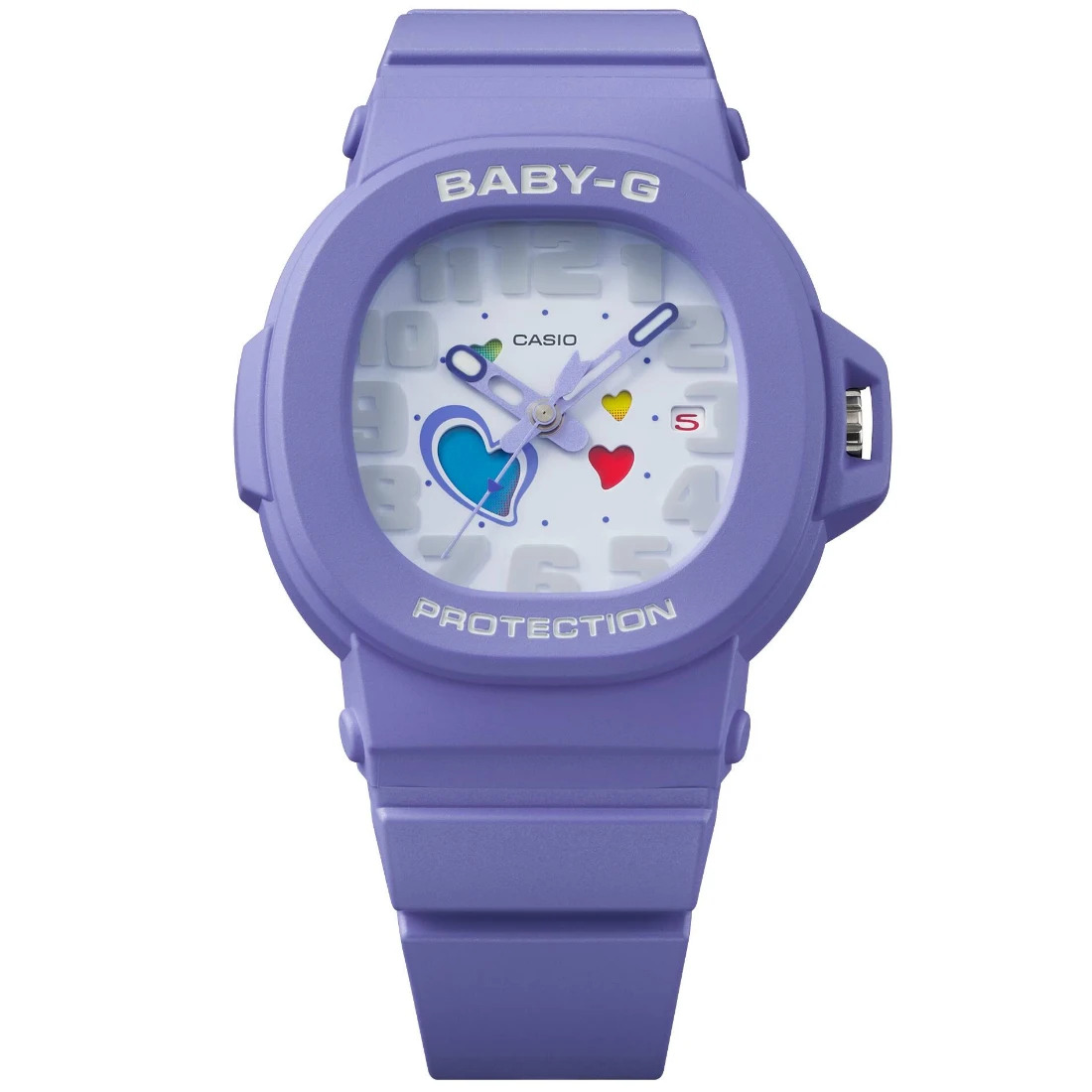 Este reloj analógico BABY-G combina diseño innovador y resistencia en un accesorio único. Su carátula cuenta con un motivo de corazones que cambian de color automáticamente cada día, a través de una rueda interna que se activa al girar el dial. También puedes personalizarlo manualmente girando la corona. El reloj presenta números arábigos en relieve de fácil lectura y una manecilla de segundos con forma de flecha de Cupido, lo que le añade un toque divertido y original. El bisel desmontable, con acabado mate, protege la corona y el cristal, además de permitir el acceso fácil para ajustar la hora, fecha o el esquema de colores.