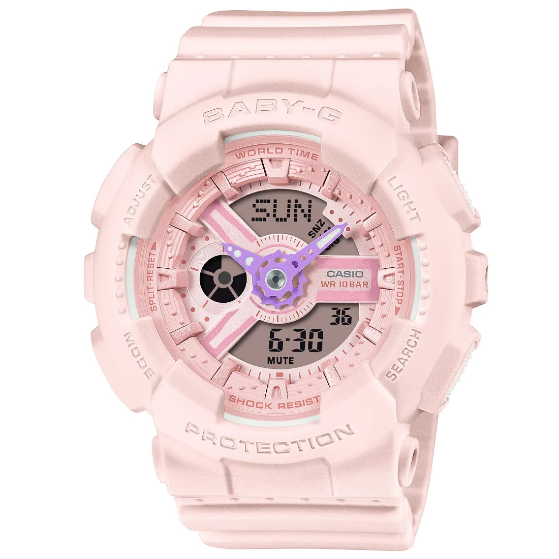 Suave y sutil, pero audaz y elegante. Detallada combinación de dial, índices y otros componentes en esquemas de color pastel suave. Los detalles en las manecillas del reloj agregan un toque de color intenso para lograr un contraste festivo que ilumina cualquier día. Más que solo lujo y estilo, estos relojes también ofrecen una estructura resistente a impactos, resistencia al agua hasta 100 metros y más. Ya sea deportes, recreación o diversión diaria, estos relojes BABY-G lo mantienen activo en todo momento.