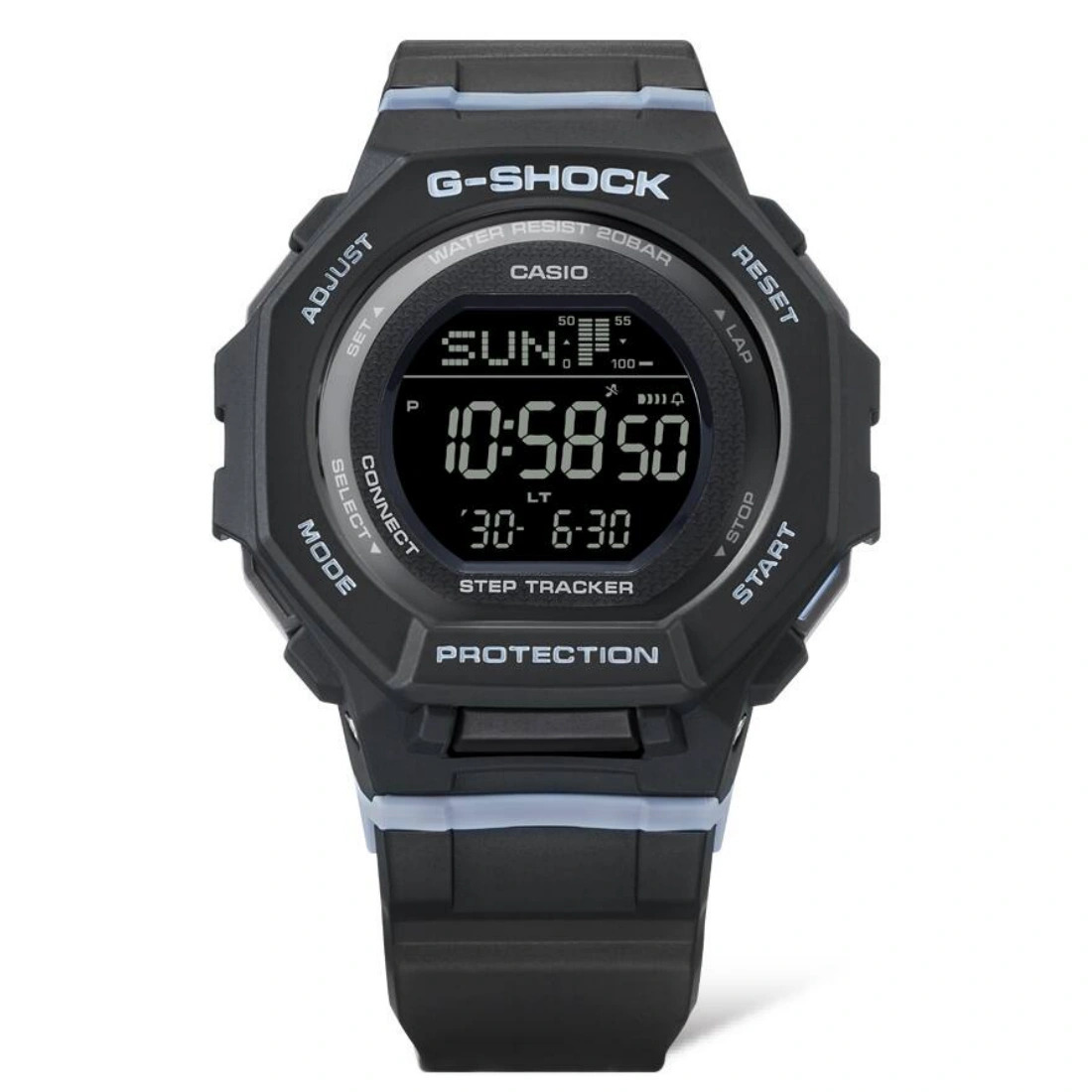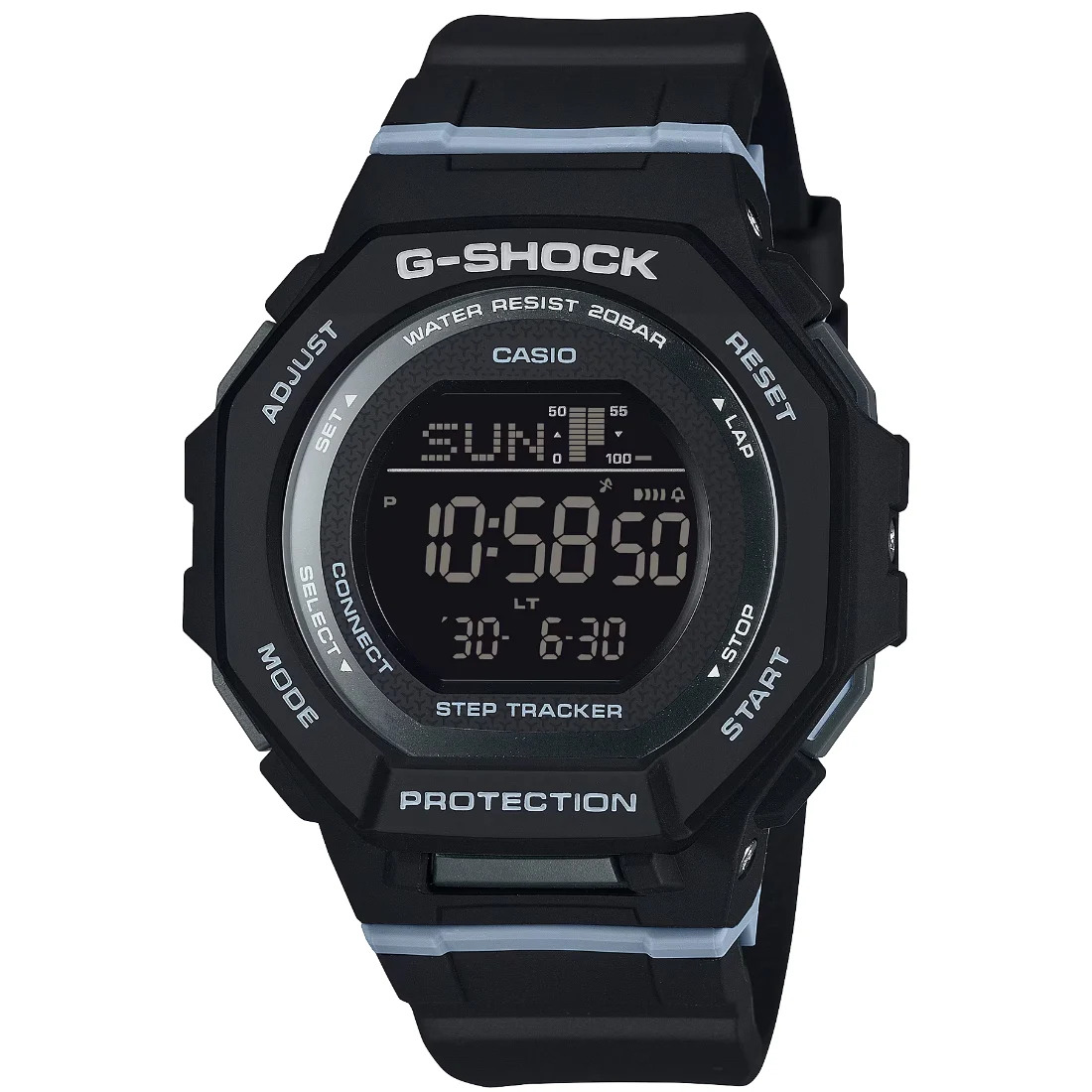 Tamaño de la caja (L× W× H): 46.4 × 43.8 × 12 mm Material de la caja/bisel: Resina/resina de base biológica Peso: 41 g Correa de resina de base biológica Resistente a impactos Resistencia al agua de 200 m Fuente de alimentación: pila Medición del conteo de pasos: Rango de visualización de conteo de pasos: de 0 a 999 999 pasos Visualización del progreso del objetivo de pasos (margen de configuración del objetivo de conteo de pasos: de 1000 a 50 000, aumentos de 1000 pasos) Gráfico de conteo de pasos (Conteo de pasos por hora para las últimas 7 horas en un gráfico de 6 niveles) Indicador de pasos
