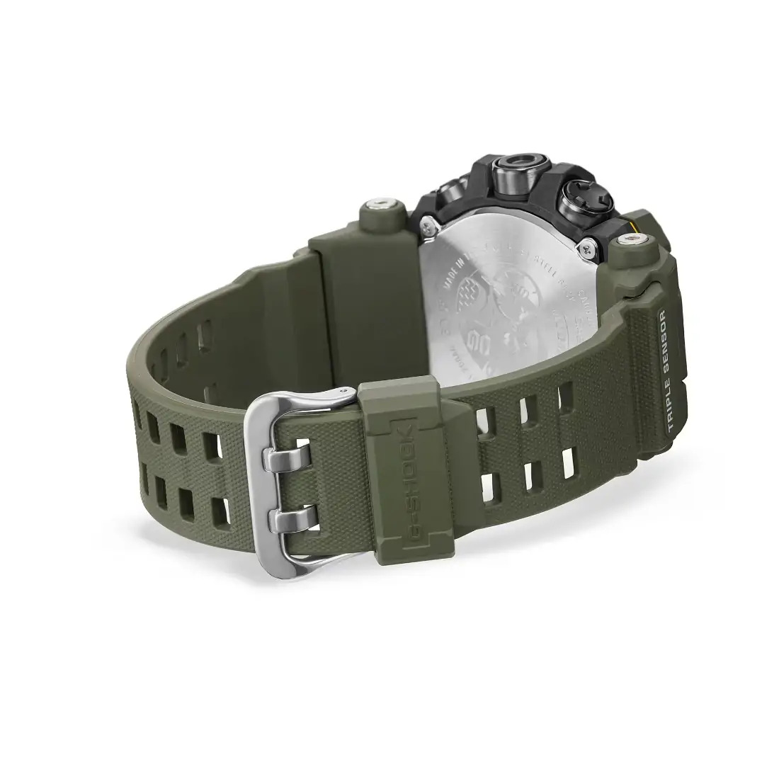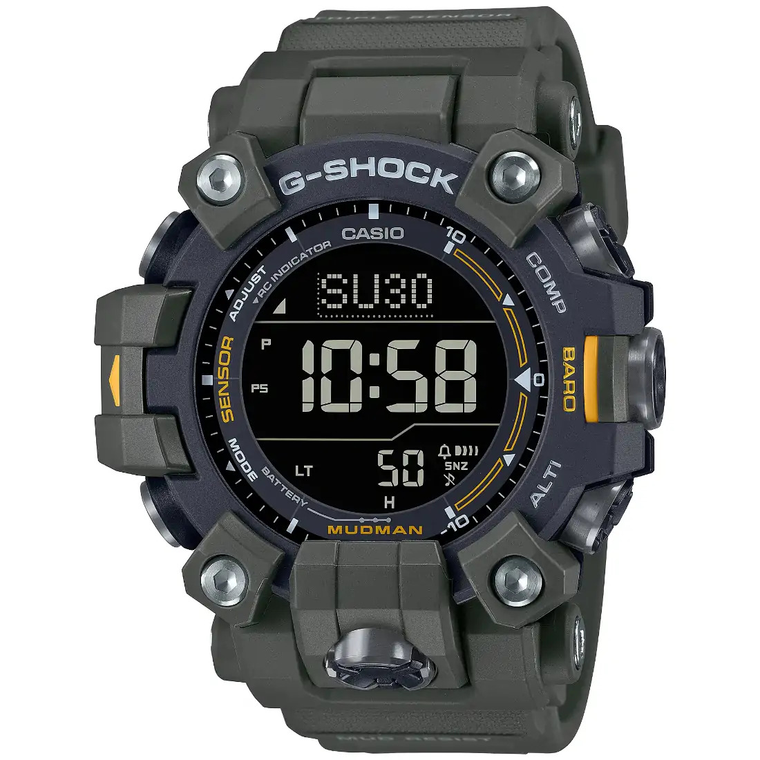 La línea de relojes G-SHOCK Master of G, desarrollada para profesionales que trabajan en los entornos más difíciles, presenta el modelo MUDMAN de sensor triple con una estructura resistente al barro. El botón frontal grande y fácil de operar y los tres botones de sensor directo en el costado están diseñados para drenar el barro y el agua y están protegidos por componentes de acero inoxidable con forma de cilindro. Los ejes de los botones están equipados con juntas de unión para evitar el ingreso de barro y polvo, de modo que está listo para recorrer los terrenos más difíciles.