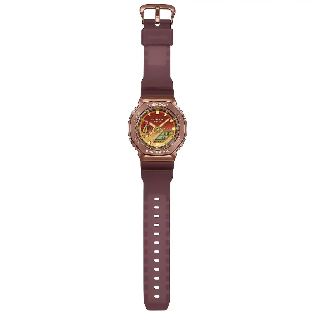 Estas versiones cubiertas de metal de los favoritos de G-SHOCK brillan con un estilo lujoso gracias al marco de metal con baño de iones de color, la deposición de vapor metálico en el dial (GM-2100 y GM-110) o la impresión de cristal en la esfera del reloj (GM-5600). A eso, súmele una colorida correa translúcida con acabado mate y está listo para recorrer la naturaleza desértica en busca de libertad y diversión. Cada uno de ellos tiene un diseño colorido que complementa cada ocasión, desde eventos formales elegantes hasta salidas casuales repletas de aventura.