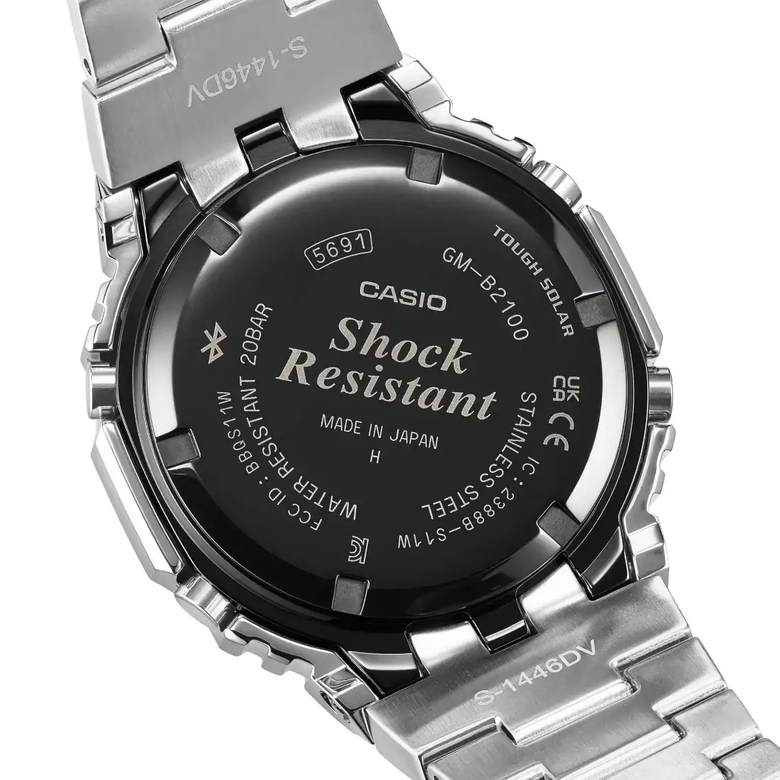 Tamaño de la caja (L× W× H): 49.8 × 44.4 × 12.8 mm Material de la caja/bisel: Acero inoxidable Peso: 165 g Correa de acero inoxidable Broche de una pulsación y triple pliegue Resistente a impactos Resistencia al agua de 200 m Fuente de alimentación: Tough Solar (con energía solar)