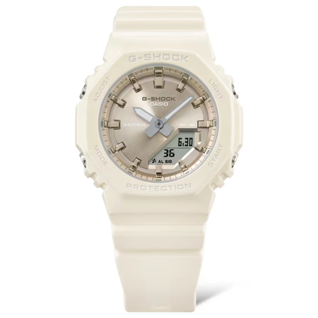 Este reloj CASIO G-SHOCK destaca por su delicado brillo perlado, aplicado a su marco y correa con un revestimiento polarizado mate que añade un toque sutil de elegancia. El dial metálico ofrece un hermoso lustre, creando un diseño minimalista y refinado. Fabricado con resina de origen biológico, este G-SHOCK no solo resalta por su estilo, sino también por su enfoque en la sostenibilidad.