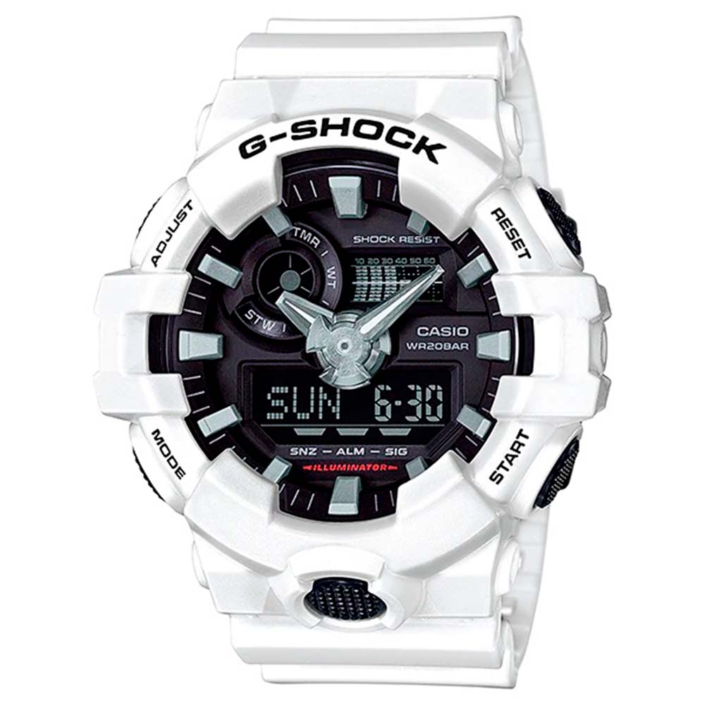 Tamaño de la caja (L× W× H): 57.5 × 53.4 × 18.4 mm Material de la caja/bisel: Resina Peso: 51 g Correa de resina Resistente a impactos Resistencia al agua de 200 m Fuente de alimentación: pila