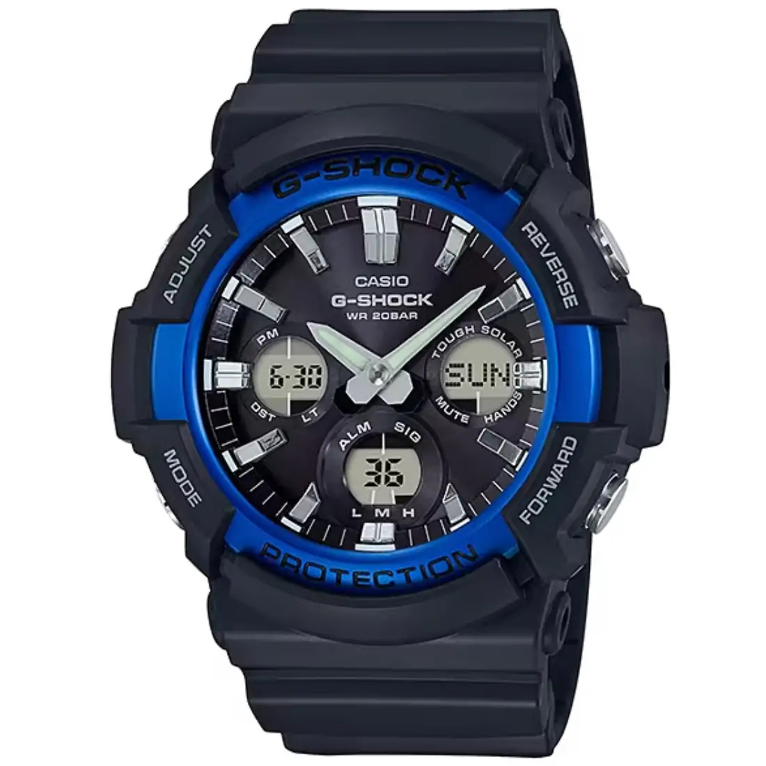 Tamaño de la caja (L× W× H): 55.1 × 52.5 × 16.7 mm Material de la caja/bisel: Resina/acero inoxidable Peso: 76 g Correa de resina Resistente a impactos Resistencia al agua de 200 m Fuente de alimentación: Tough Solar (con energía solar)