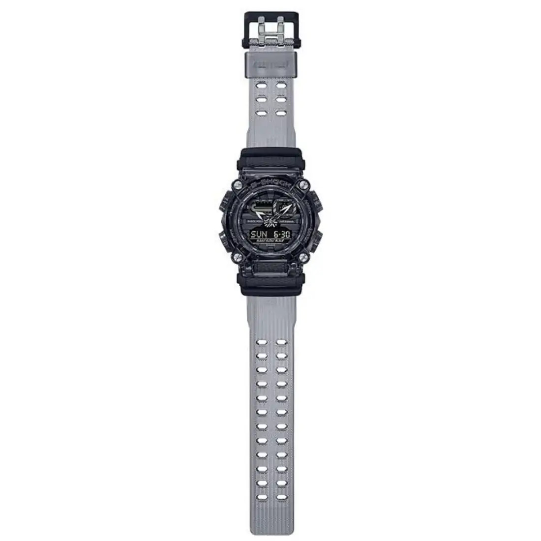 Tamaño de la caja (L× W× H): 52.8 × 49.5 × 16.9 mm Material de la caja/bisel: Resina Peso: 65 g Correa de resina Resistente a impactos Resistencia al agua de 200 m Fuente de alimentación: pila