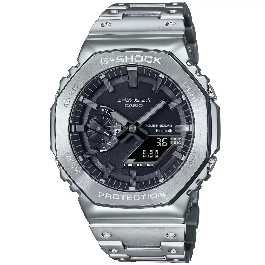 Tamaño de la caja (L× W× H): 49.8 × 44.4 × 12.8 mm Material de la caja/bisel: Acero inoxidable Peso: 165 g Correa de acero inoxidable Broche de una pulsación y triple pliegue Resistente a impactos Resistencia al agua de 200 m Fuente de alimentación: Tough Solar (con energía solar)