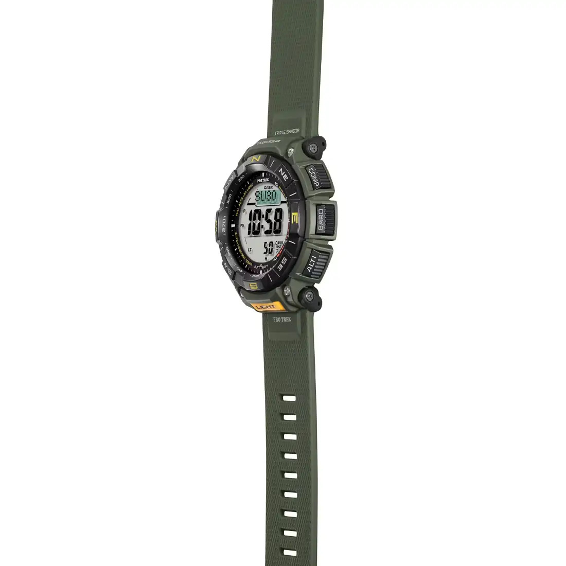Tamaño de la caja (L× W× H): 54.7 × 51.7 × 15.1 mm Material de la caja/bisel: Resina de base biológica Peso: 54 g Correa de uretano suave (resina de base biológica) Resistente a bajas temperaturas (-10°C / 14°F) Resistencia al agua de 100 m Fuente de alimentación: energía solar Altímetro Barómetro Brújula Termómetro