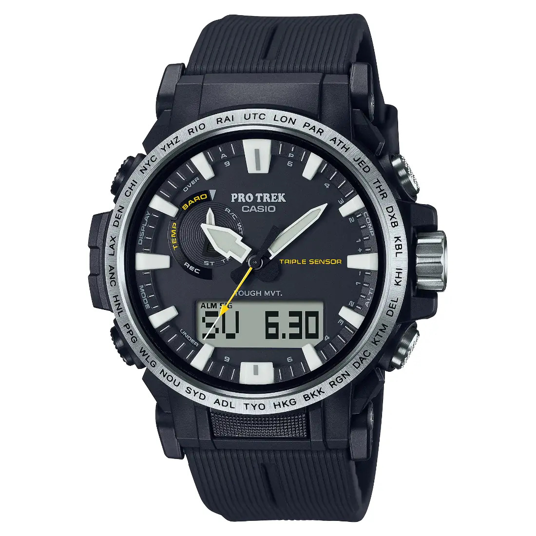 Hora mundial para 29 zonas Cronómetro Temporizador con cuenta regresiva 5 alarmas diarias Señal de hora Luz LED doble Función de silencio Corrección automática de la posición inicial de la aguja Función de ahorro de energía Indicador de carga de pila Precisión: h15 segundos por mes (sin señal de calibración) Característica de cambio de las agujas (manual o automático (durante la medición de la presión barométrica, la altitud y la temperatura)) Funciones clásicas de reloj: Analógica: 3 manecillas (hora, minuto [la manecilla se mueve cada 10 segundos], segundo) Digital: horas, minutos, segundos, a. m./p. m., mes, fecha, día Recepción de señal de calibración de hora Recepción automática hasta seis* veces al día (las recepciones automáticas restantes se cancelan en cuanto tiene lugar una recepción exitosa) * 5 veces al día para la señal de calibración china Recepción manual Resultados de última recepción de señal