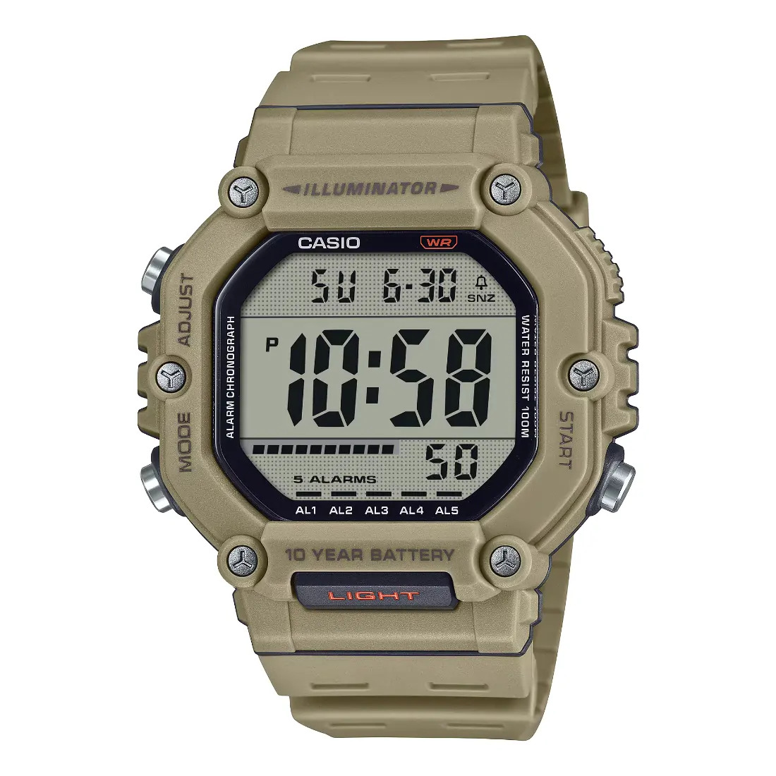Lleve la funcionalidad y el estilo a otro nivel con este reloj de carcasa grande y pantalla LCD de alta visibilidad. Su diseño imponente no solo ofrece un look moderno_ sino que también facilita una experiencia de uso intuitiva y práctica. Con un botón de luz LED frontal para mejorar la visibilidad en cualquier condición_ una resistencia al agua de hasta 100 metros_ y una batería de 10 años de duración_ este reloj está listo para cualquier desafío. Además_ sus múltiples funciones_ como hora dual_ cronómetro_ temporizador y alarma_ lo convierten en el compañero ideal para mantenerse organizado y a tiempo_ ya sea en el trabajo_ el deporte o la aventura.