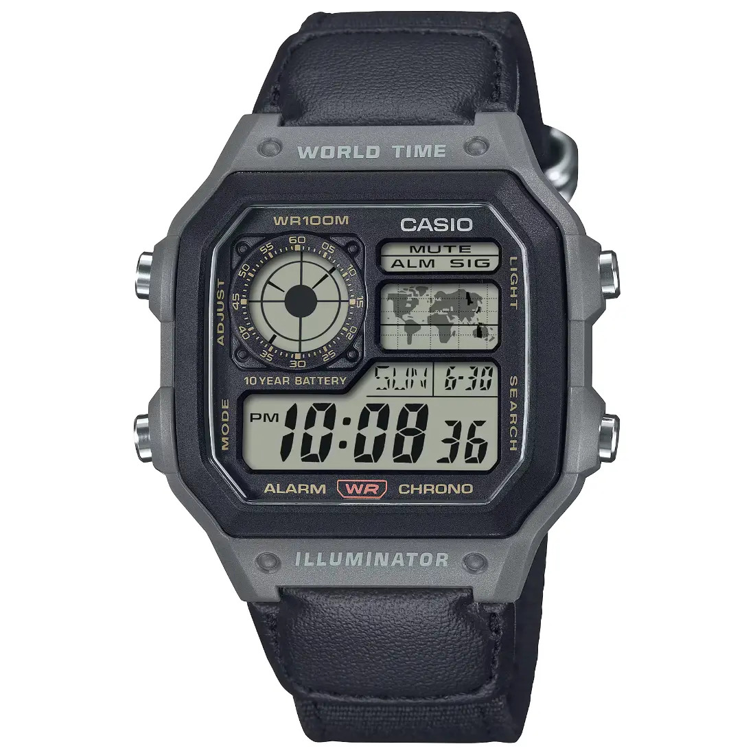 Relojes digitales CASIO: diseño multifuncional con estilo audaz y tecnología innovadora. La pantalla digital superior izquierda mantiene siempre visible la hora de tu lugar de origen_ incluso al usar herramientas como el cronómetro. En la esquina superior derecha_ el mapa mundial se alinea con la hora actual en la pantalla LCD inferior_ ideal para seguir tu camino sin complicaciones.