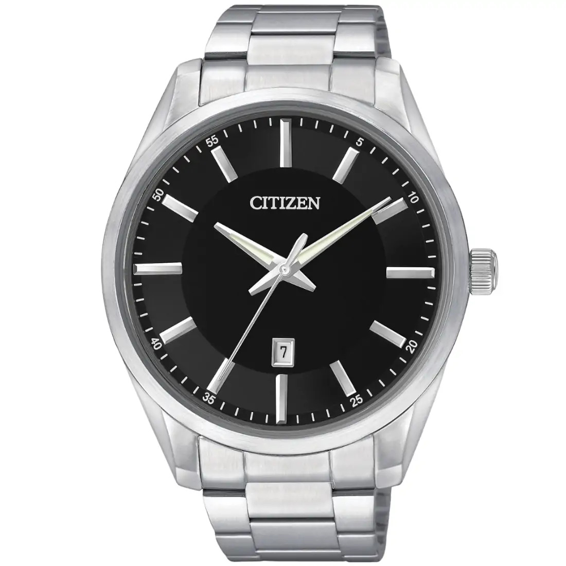 Reloj Citizen Cuarzo BI1030-53E para caballero. La carátula negra contrasta con la caja y brazalete de acero inoxidable.