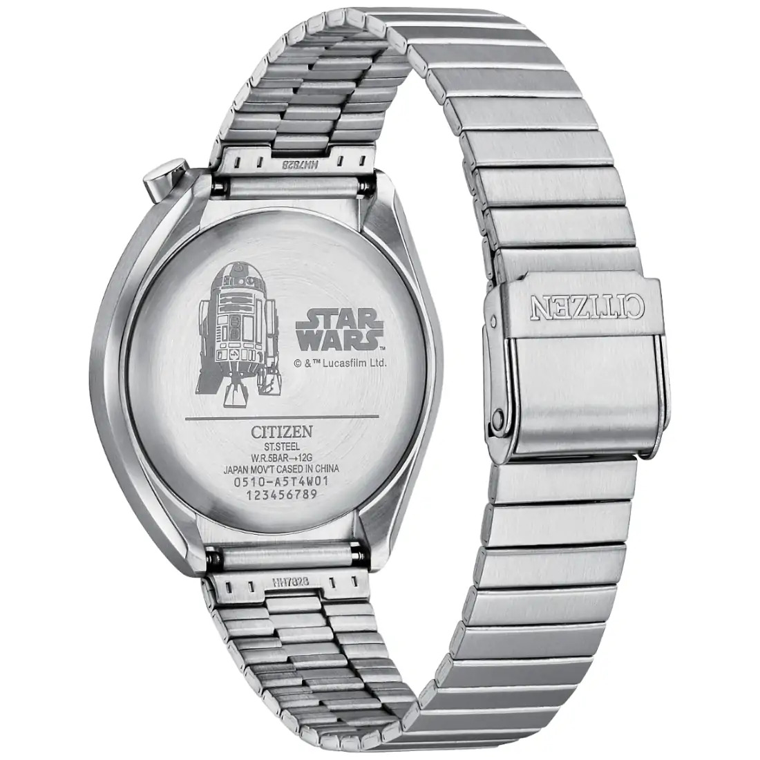 El conjunto de funciones del reloj inspirado en R2-D2 de la colección Star Wars™ | CITIZEN®? te hará tan ingenioso como el mismísimo droide astromecánico. La caja de acero inoxidable en tono plateado refleja el diseño de R2-D2, al igual que la carátula, que tiene un aspecto en relieve que recuerda a sus paneles y está acentuada con los distintivos detalles azules y rojos de R2-D2. La subcarátula en la posición de las 6 también tiene un detalle de R2-D2 en miniatura, y el reloj cuenta con cronógrafo, fechador y brazalete de acero inoxidable plateado. El logotipo clásico de Star Wars está grabado en el reverso de la caja, junto con una intrincada imagen del obediente droide.