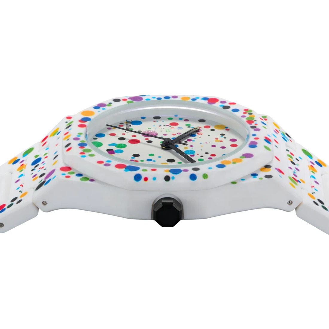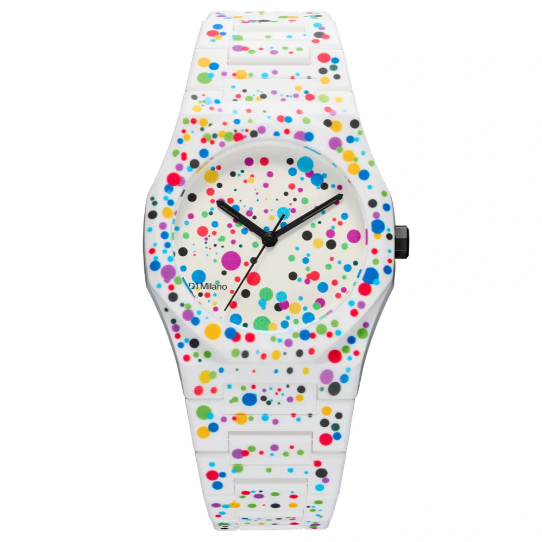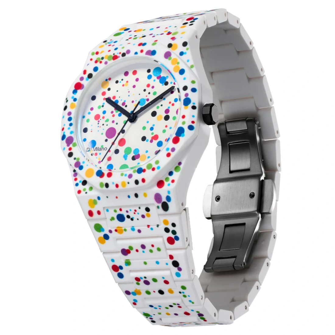 El nuevo Poly Dot se inspira en el movimiento expresionista abstracto y, gracias a la famosa técnica de goteo empleada por los artistas del movimiento, nos permitió verter pintura líquida de colores sobre la superficie de policarbonato del reloj, creando así algo único y artístico. El objeto de diseño es nuestro lienzo, y el resultado final es un producto que te acompañará sin resultar banal.