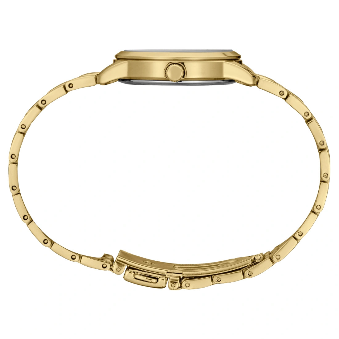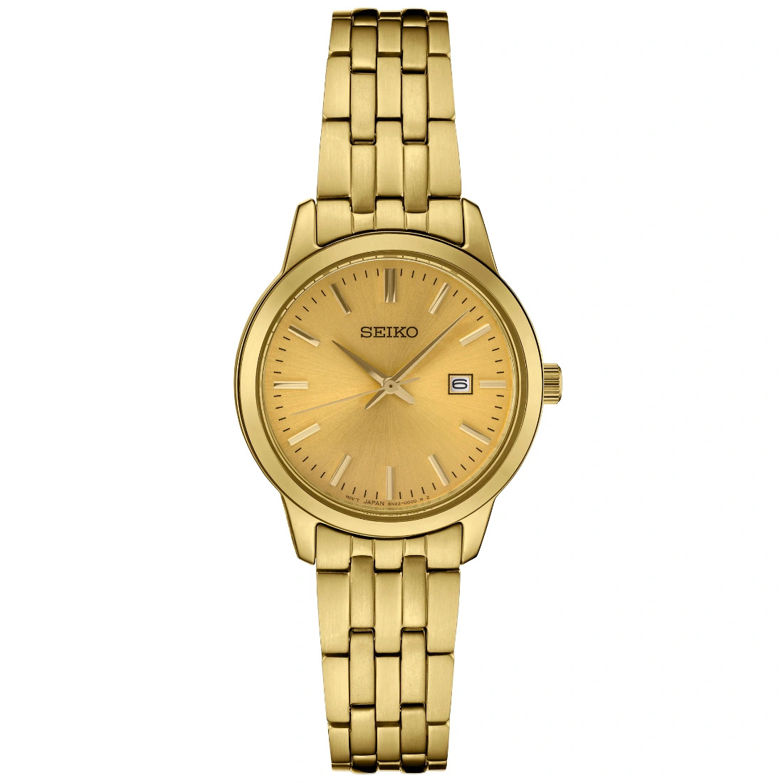 Con diseños clásicos, la Colección Essentials ofrece la solución ideal para usar todo el día. Fabricado en acero inoxidable con acabado dorado, este reloj, a la medida, presenta una esfera minimalista contemporánea color champán con agujas e índices dorados, además de un calendario con fecha, para una magnífica combinación de claridad y estilo.