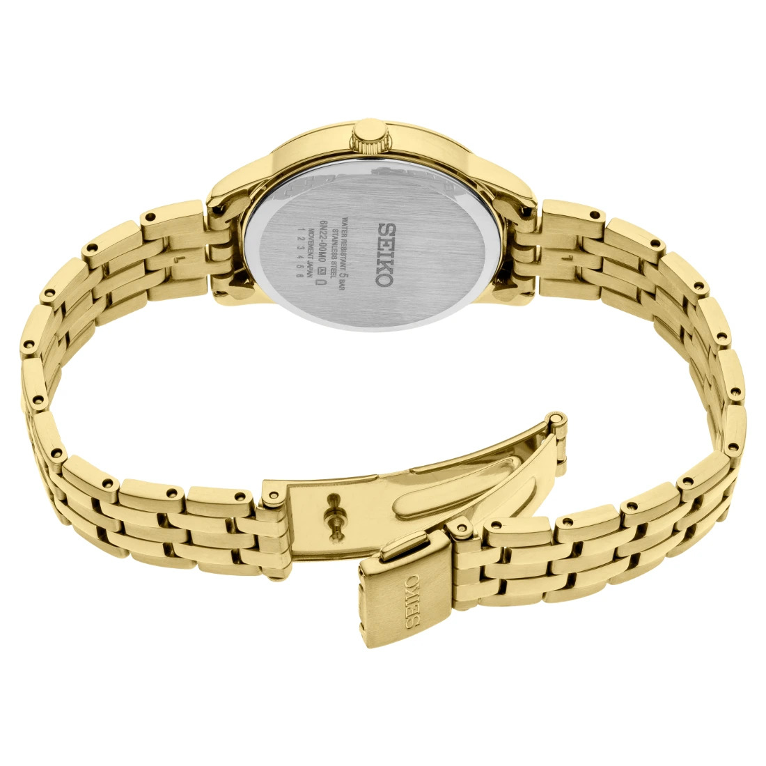 Material de la caja Caja de acero inoxidable con acabado dorado.