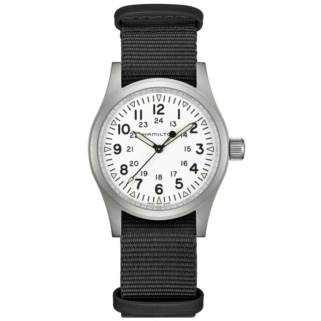 El Khaki Field Mechanical, pequeño y robusto, es el compañero ideal para tus salidas a la naturaleza. La esfera de color blanco mate, presentada en una caja de acero inoxidable de 38 mm, cuenta con índices negros en contraste con revestimiento de Super-LumiNova® para una legibilidad óptima. Gracias a su resistente correa, el Khaki Field Mechanical es una fiel representación de su antecesor original de la década de 1960 y del legado militar de Hamilton.