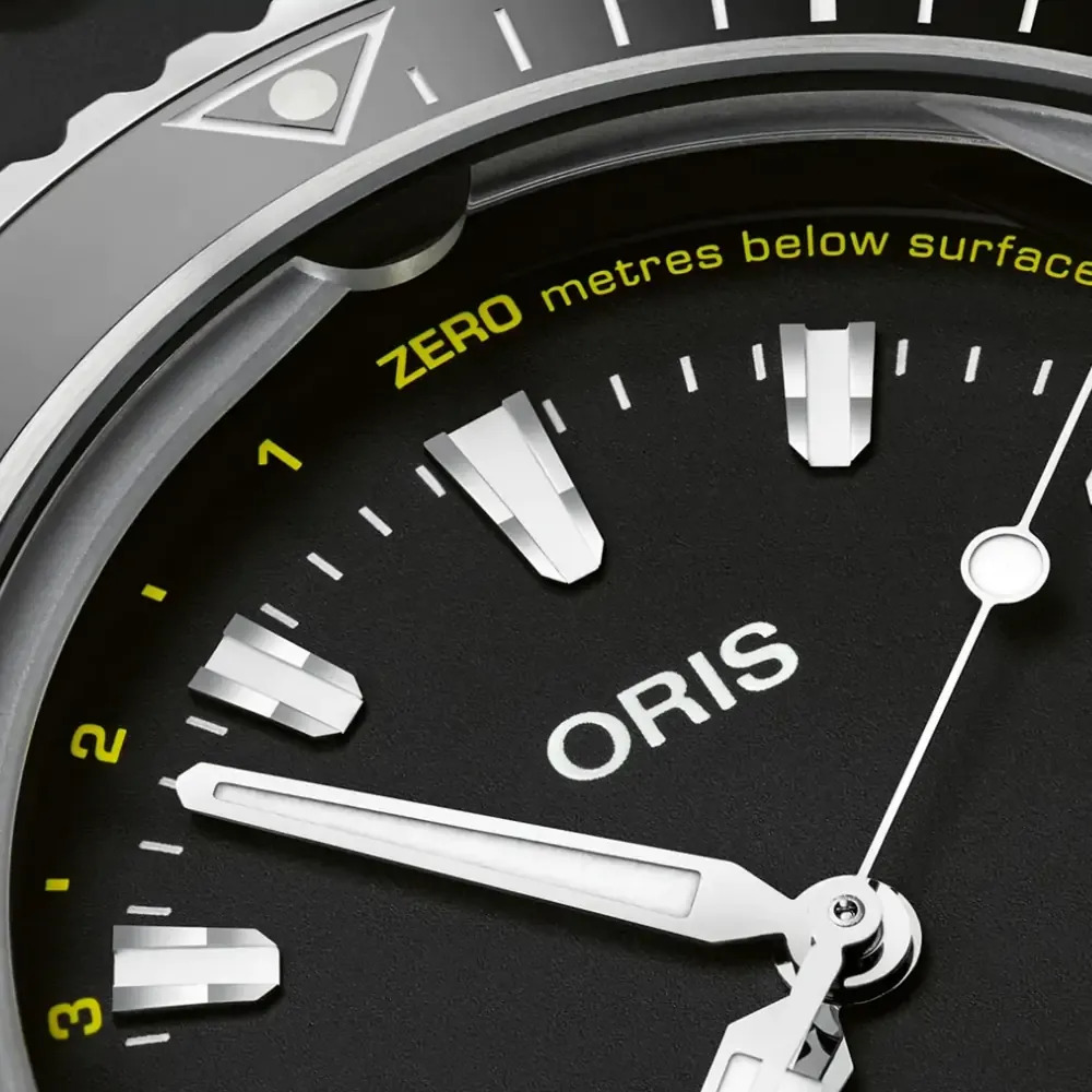 Conocido cariñosamente como "el reloj con un agujero", el Aquis Depth Gauge utiliza los principios científicos de la ley de Boyle-Mariotte para crear un indicador que mide inequívocamente la profundidad durante una inmersión. El sistema patentado funciona dejando pasar el agua a través de un orificio en el cristal de zafiro, situado en las 12 horas, y hacia un canal fresado alrededor del borde exterior del cristal. Esto crea una marca de agua que se corresponde con un medidor que se indica con claridad en amarillo en la esfera.