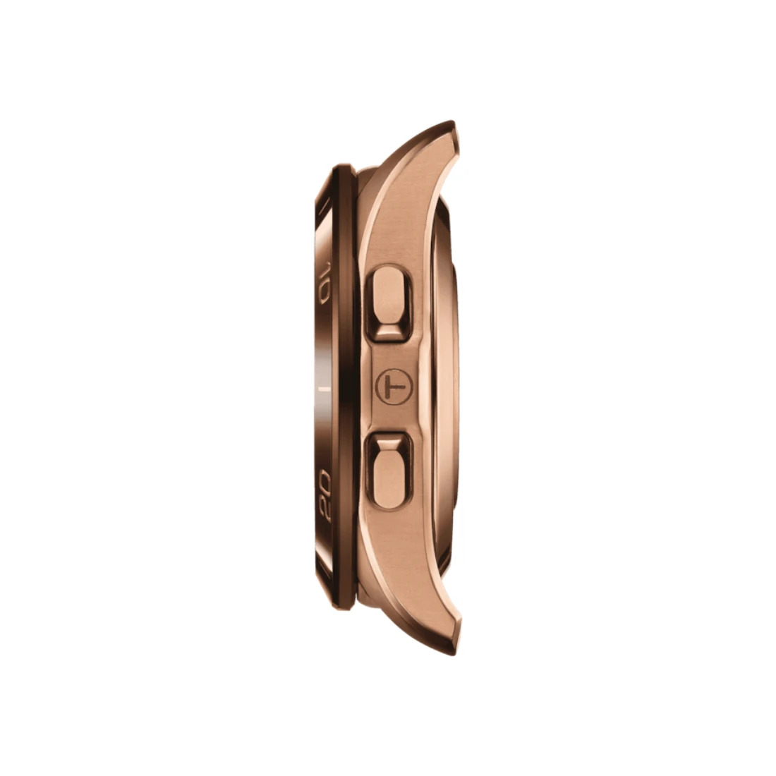 Longitud: 43.00 Anchura: 43.75 Grosor: 13.5 Astas: 21.00 Forma de la caja: Redonda Material de la caja: Caja de titanio antimagnético con revestimiento de pvd de oro rosa Opciones de la caja: Bisel de cerámica Cristal: Cristal de zafiro táctil